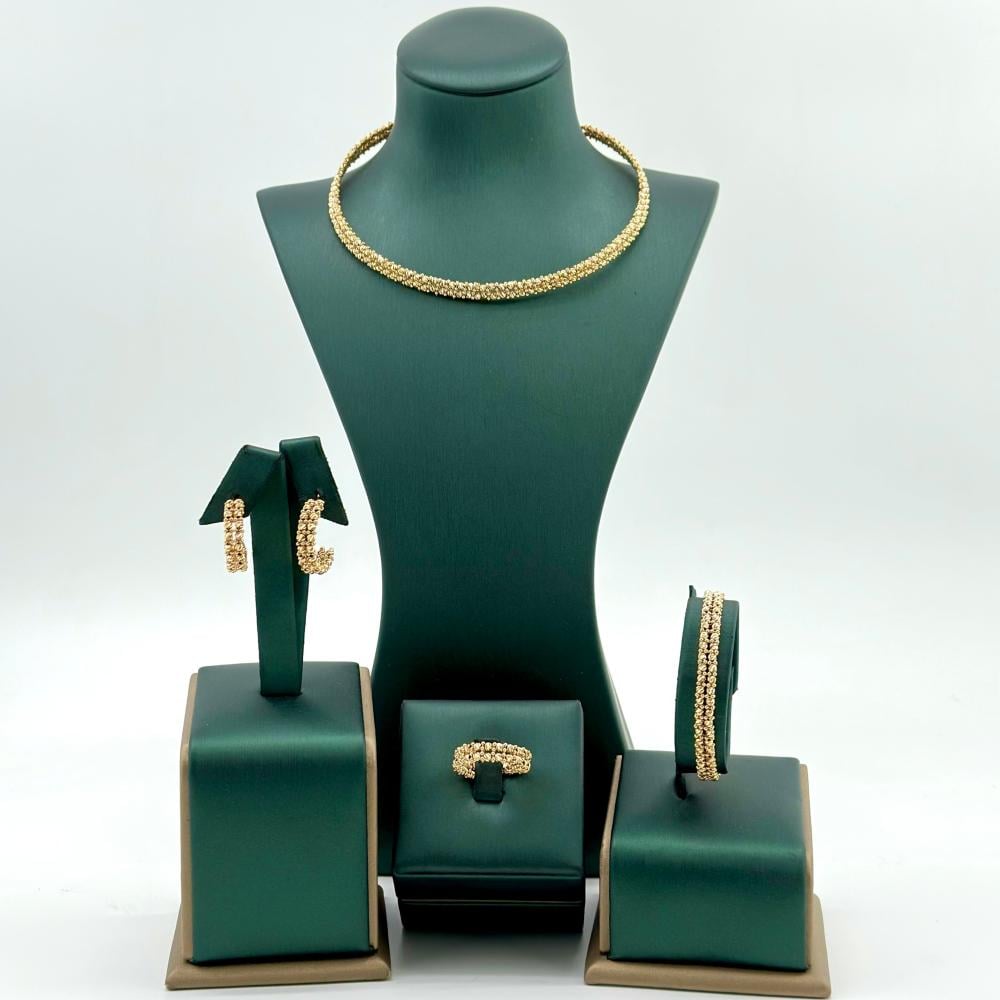 تميّزي بإطلالة راقية مع طقم ذهب كلاسيكي مصمم بذوق عالي يليق بكل مناسبة فخمة. مصنوع من ذهب نقي عيار 21، بوزن 37.8 جرام، ويتميز بتفاصيل ناعمة تبرز أنوثتك بأسلوب كلاسيكي لا يطلع من الموضة. مثالي للعروس أو هدية ثمينة تبقى ذكرى غالية.
