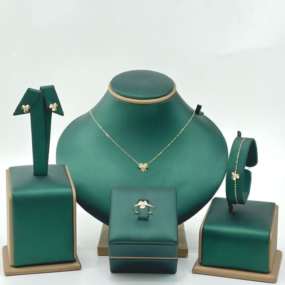 طقم ذهب "الوردة" بتصميم مستوحى من بريق الألماس، مصنوع من ذهب عيار 18 ووزنه 2.1 جرام فقط. تصميمه الناعم والأنثوي يجعله الخيار الأمثل للبس اليومي أو كهديّة راقية تليق بكل مناسبة. حيث يتألق بتصميمه على شكل وردة رقيقة مرصعة بفص الزريكون البراق، ليعكس جمالًا هادئًا وأناقة راقية, يتضمن الطقم عقدًا مميزًا وخاتمًا ناعمًا وأسوارة أنيقة وحلقًا دقيقًا، كلها مصنوعة من الذهب عيار 18 بأعلى جودة،