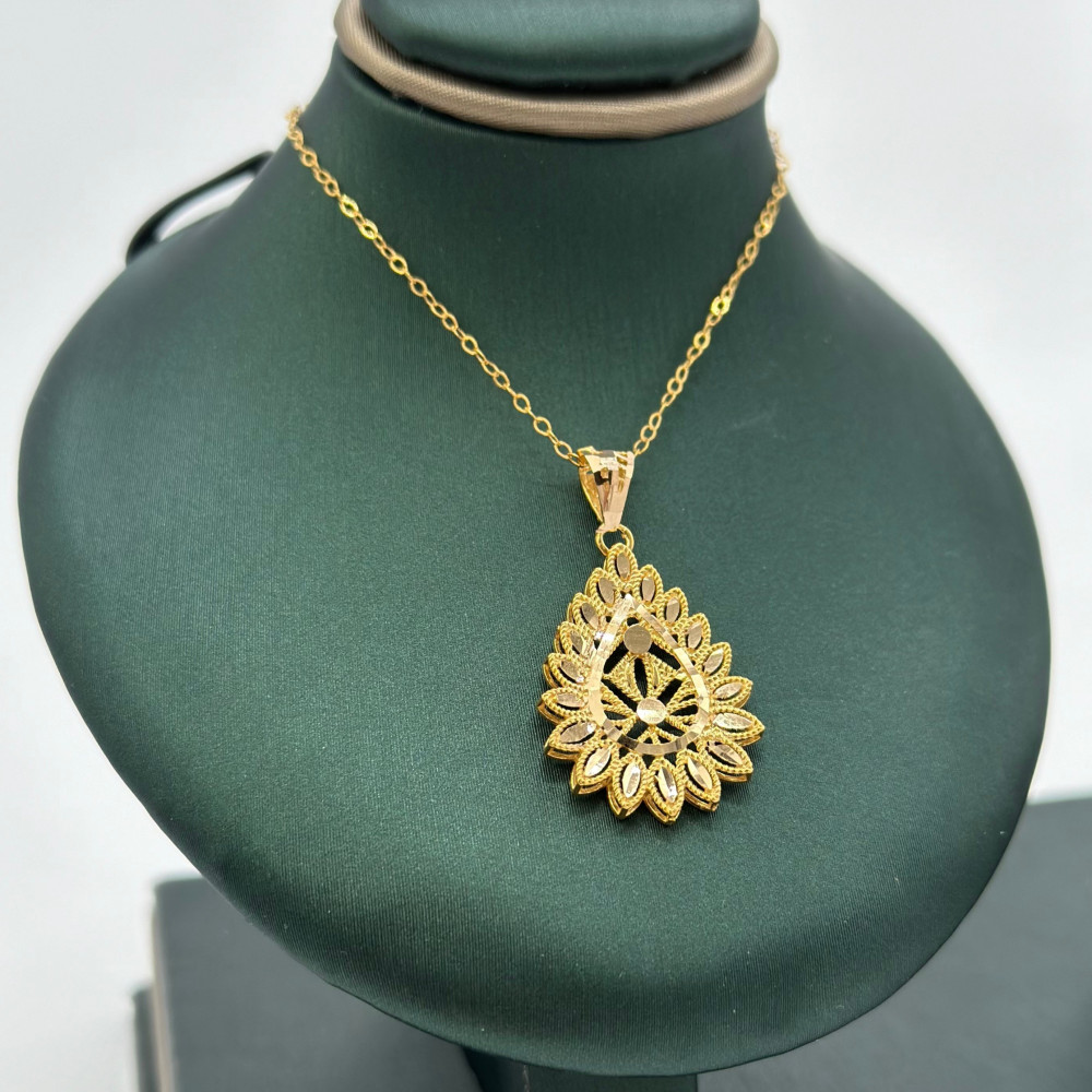 إن اللمعان الذهبي الرائع الذي يتمتع به نصف طقم الذهب عيار 21 يجذب الأنظار ويعكس تألقه الفريد. يتلألأ الذهب الخالص بجماله المتلألئ تحت أشعة الشمس والإضاءة، مما يضفي على الطقم سحرًا لا يقاوم.