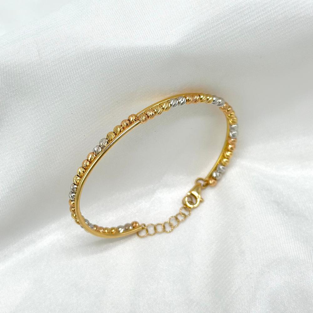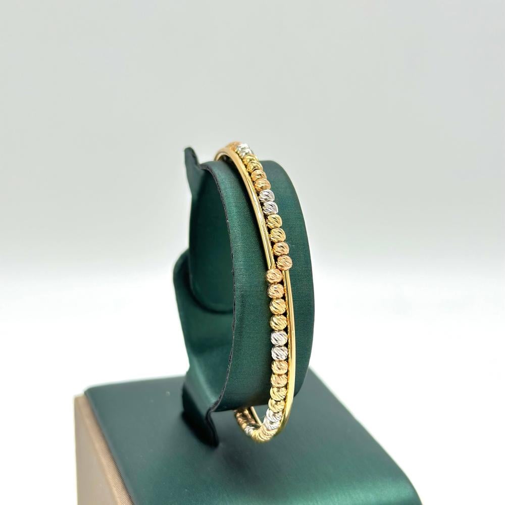 اسوارة ذهب عيار 18 من مجوهرات الشلوي تتميز بتصميم أنيق يجمع بين الكلاسيكية والعصرية. تتألف من كرات ليزر مصفوفة بدقة باللونين الأصفر والأبيض، مما يضفي تبايناً جذاباً يلفت الأنظار. هذه الاسوارة الفاخرة تضفي لمسة من الأناقة والرقي، مما يجعلها مثالية للمناسبات الخاصة والإطلالات اليومية.✨