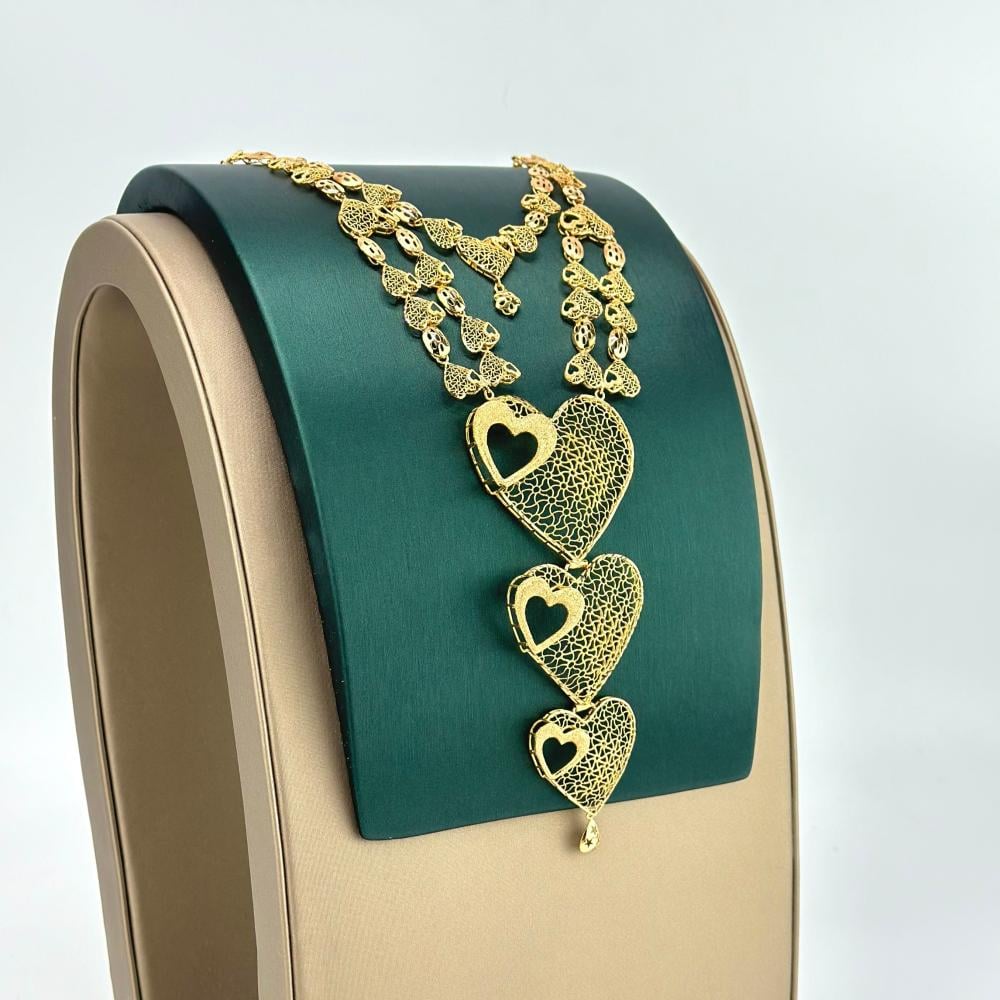 طقم ذهب كبير للعروس بعيار 21 ووزن 45.5 جرام، بتصميم القلوب الفاخر اللي يرمز للحب والرقي. تفاصيله الراقية ولمعته الفريدة تضيف لمسة ملكية لإطلالتك في يومك المميز. احجزيه الآن وتألقي بأناقة تخطف الأنظار