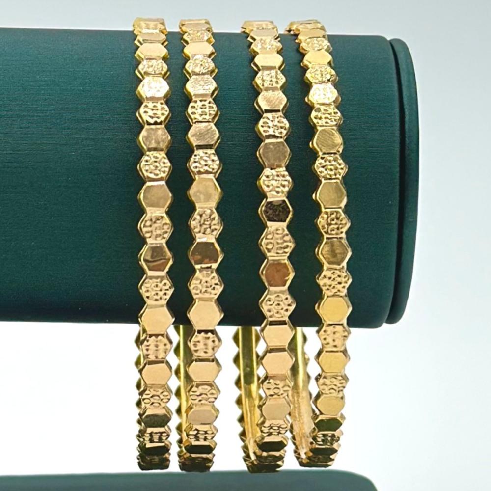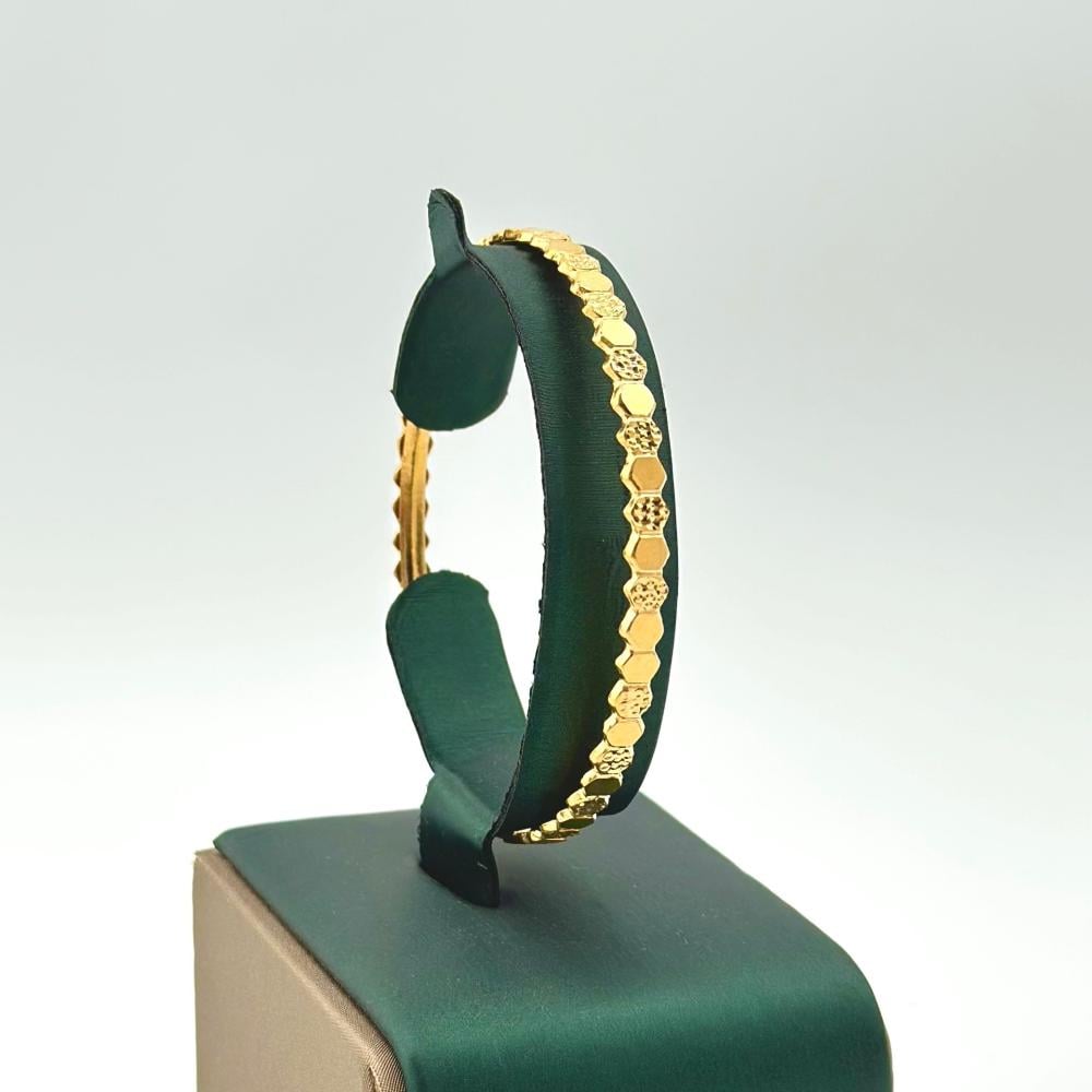 غوايش ذهبية أنيقة مصاغة من ذهب عيار 21 الخالص، بتصميم "شوميه" الكلاسيكي السادة الذي يجمع بين البساطة والرقي في آنٍ واحد. يتميز هذا النوع من الغوايش بسطح ناعم ولامع بالإضافة لنقش بسيط، خالٍ تمامًا من الفصوص ، ليمنح الإطلالة لمسة من الأناقة الصامتة التي لا تحتاج إلى تفاصيل مبالغ فيها لإبراز جمالها.