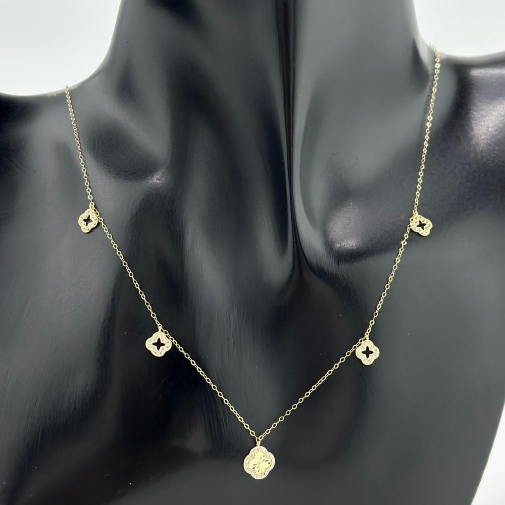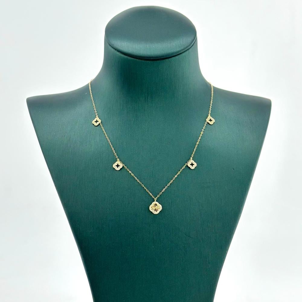 قطعة تشوكر ذهبية خفيفة الوزن تتلألأ بسحر الطبيعة، إذ تتزين بعدة زهور متناغمة من الذهب، وفي قلب كل زهرة تتألق أحجار الزركون ببريق مذهل. تمثل هذه الزهور رمزاً للجمال الطبيعي والحيوية، مع إضافة لمسة من الأناقة والفخامة , بتفاصيلها الدقيقة وتصميمها الأنيق، تتألق هذه القلادة كقطعة فنية تجسد جمال الطبيعة بكل أبهى صورها.