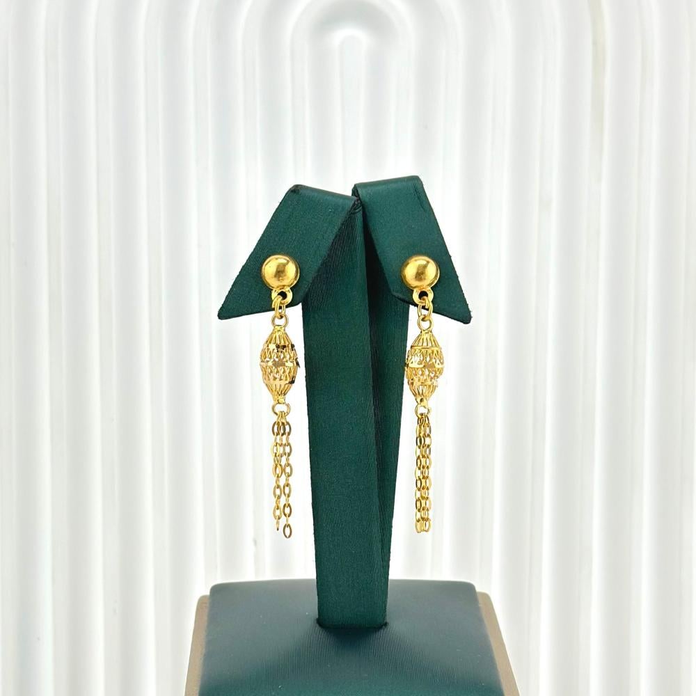 حلق من الذهب الأصفر عيار 21 بتصميم بيضاوي أنيق، يجمع بين البساطة والرقي. تضفي تفاصيله المتقنة لمسة من الفخامة والجمال الخالد على إطلالتك.