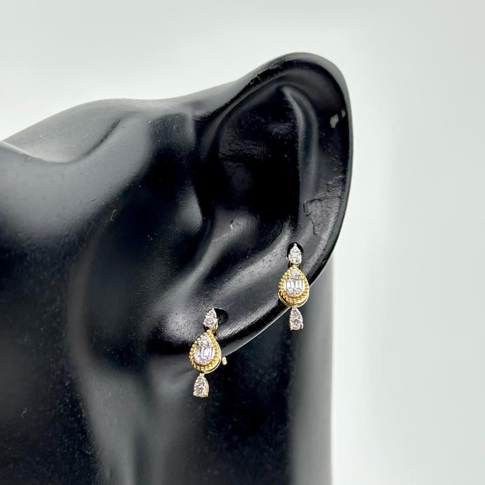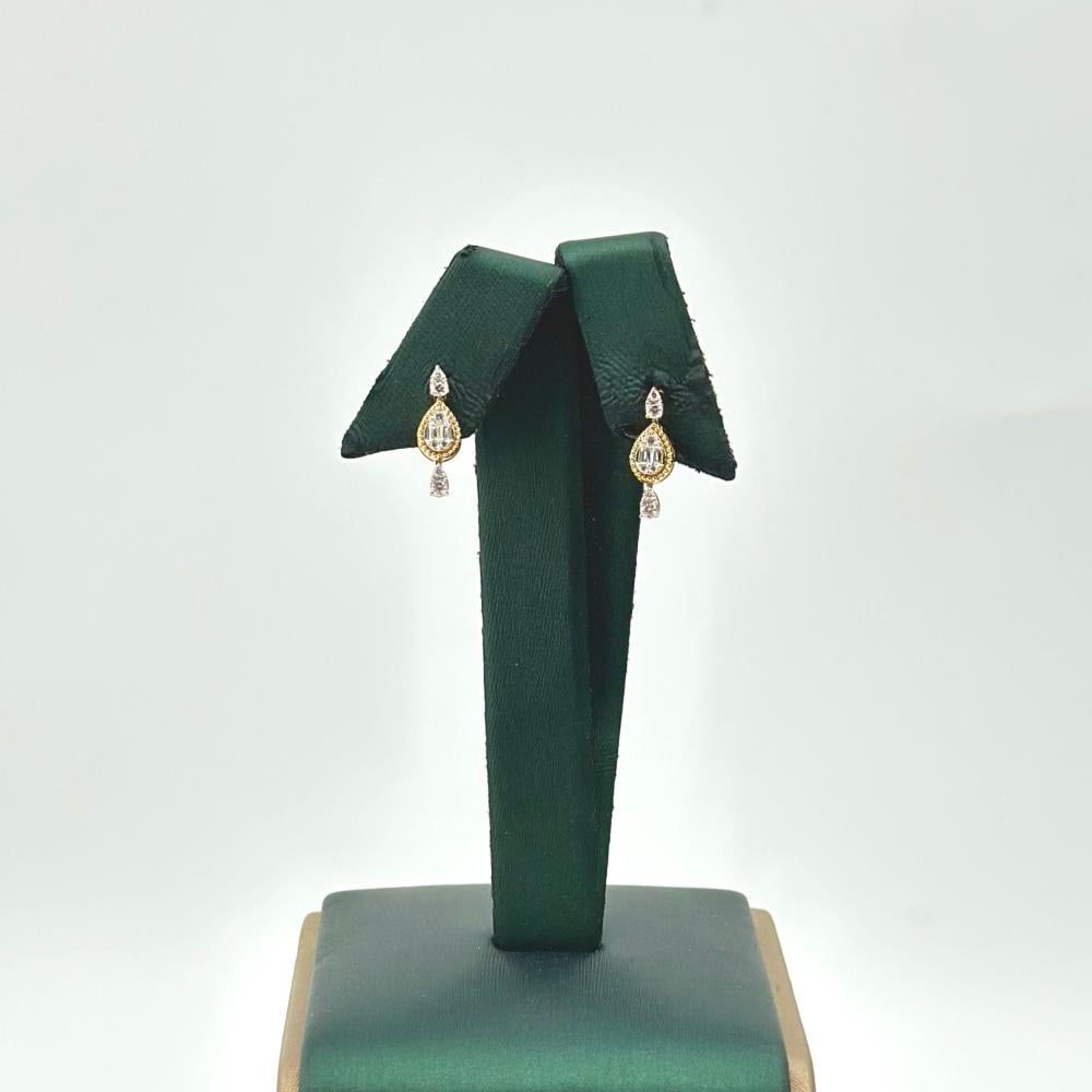 حلق الذهب عيار 18 من مجوهرات الشلوي يأتي بتصميم الماس أنيق يجسد روعة اللمعان. ينبض بأناقة لا مثيل لها، حيث تتداخل ألوان الذهب الاصفر مع انعكاس الضوء على فصوص الزركون، مما يضفي عليه لمسة من الفخامة والجمال.