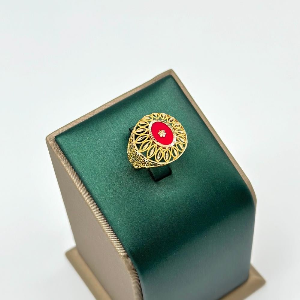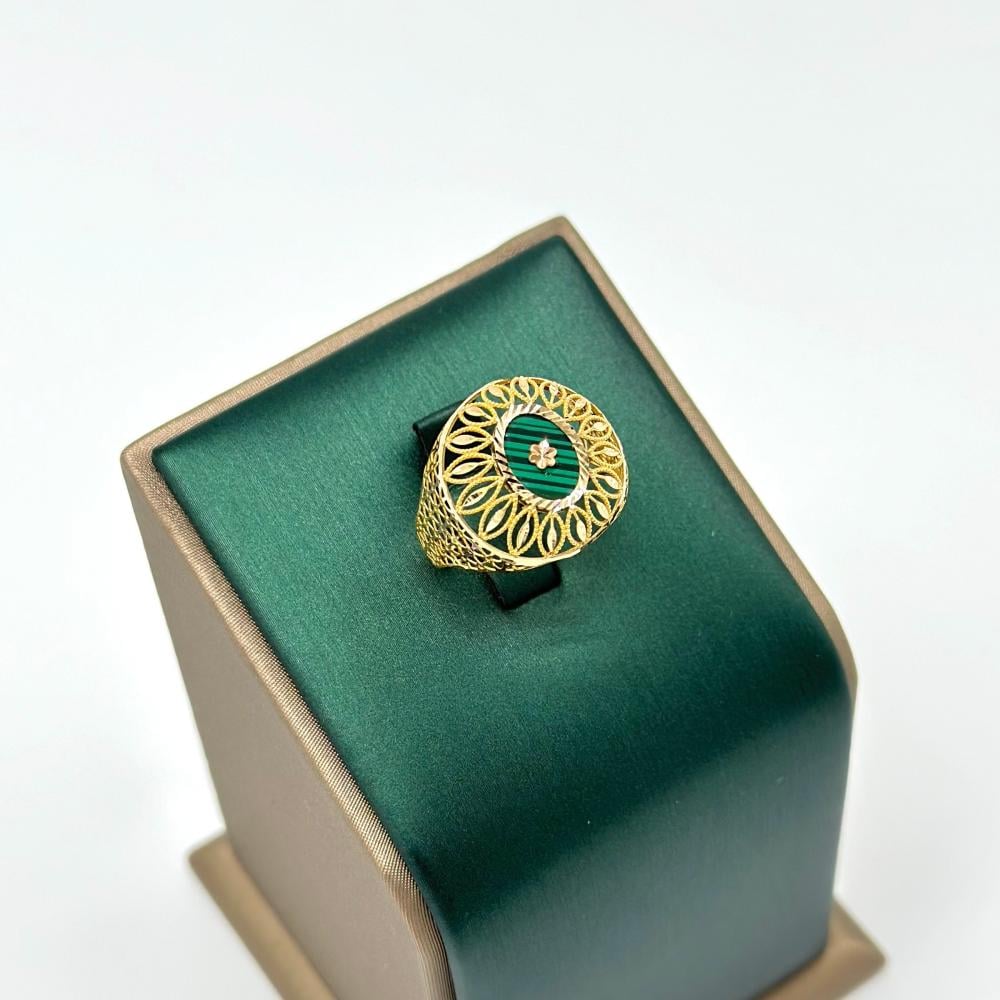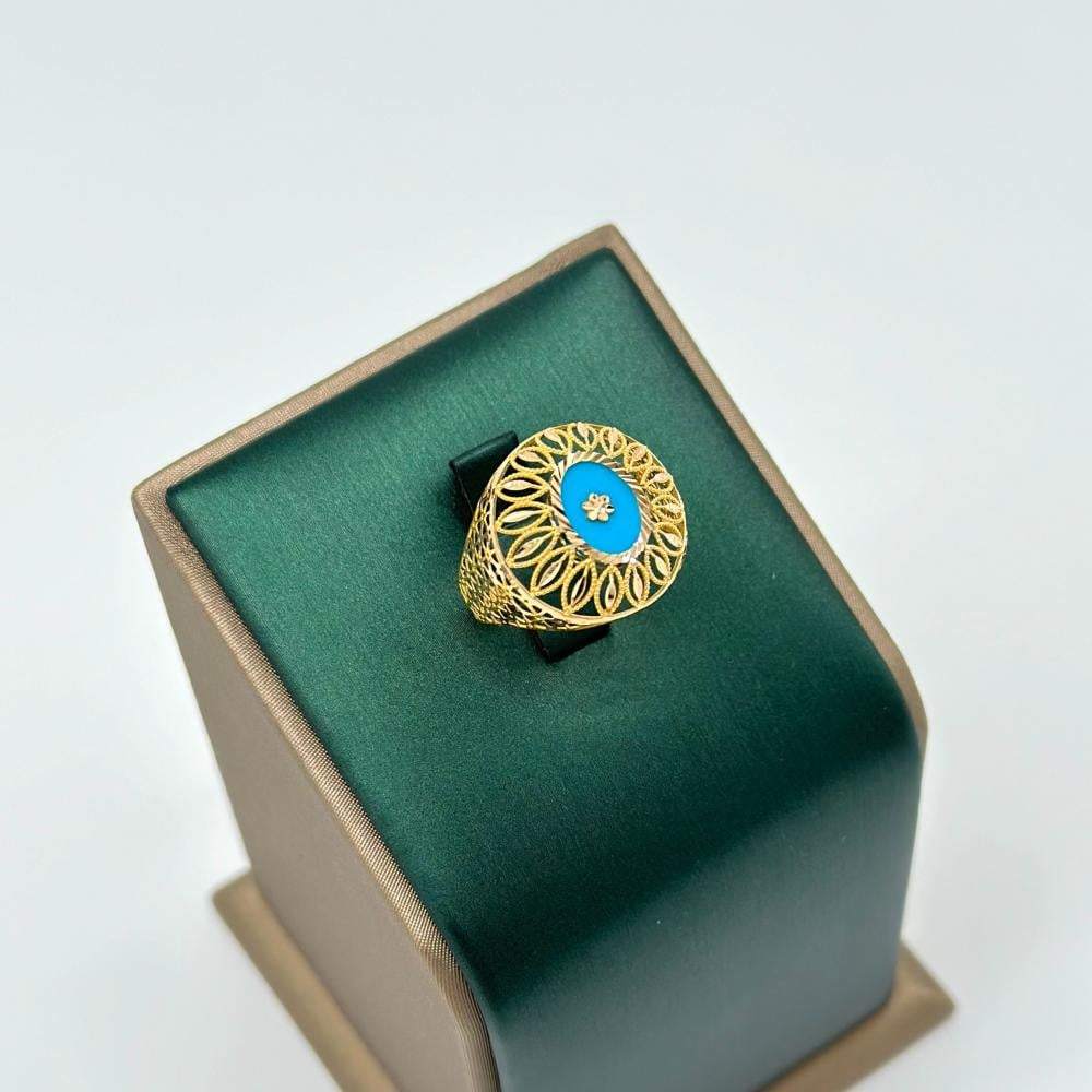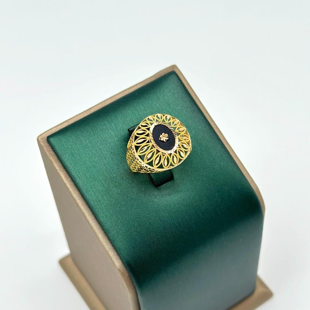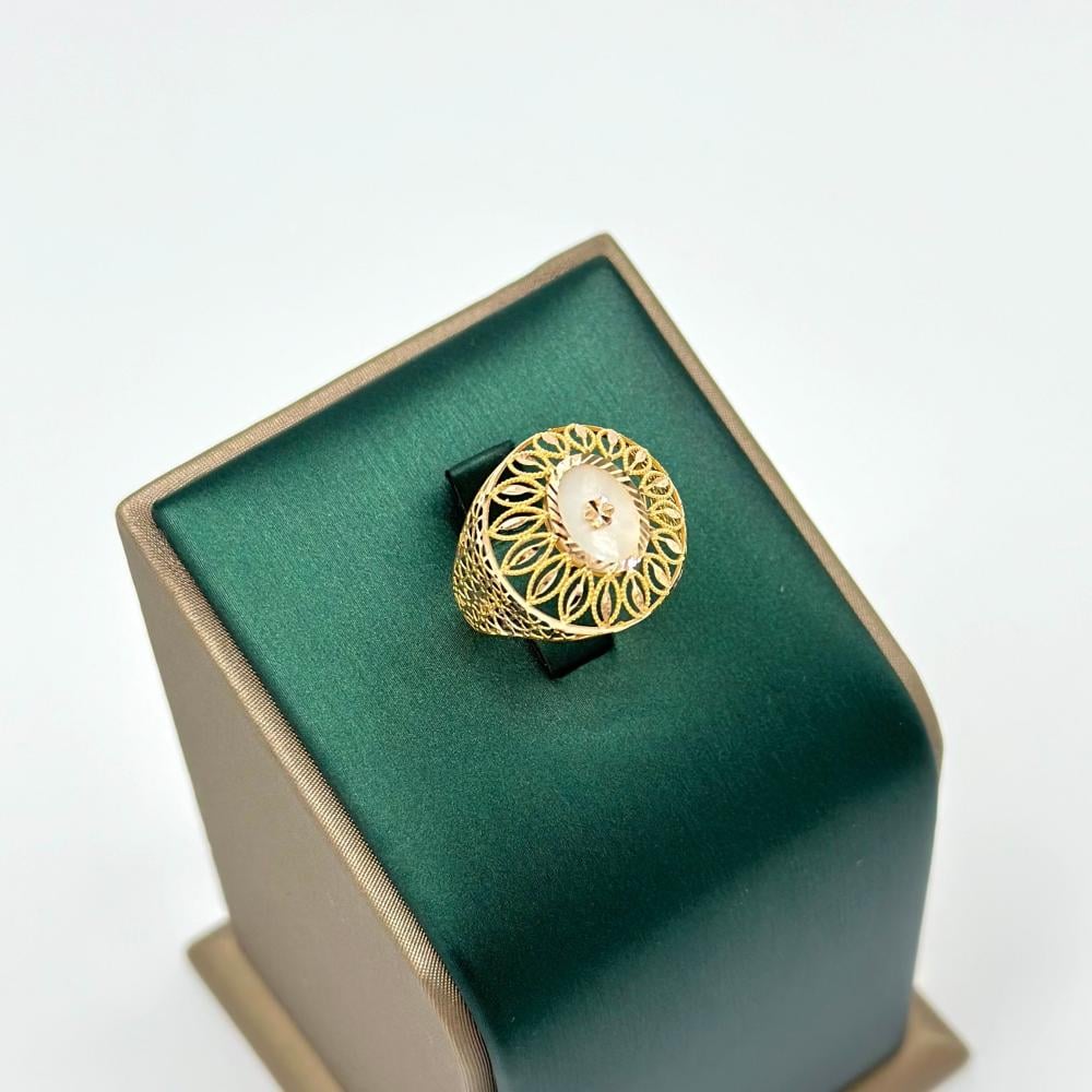 خاتم ذهبي عيار 21، مرصع بنقوش فنية تضفي جاذبية مميزة، ويتزين بحجر صدفي بألوان زاهية، ينبض بأناقة لا مثيل لها، مكملاً لجمال وسحر من ترتديه.