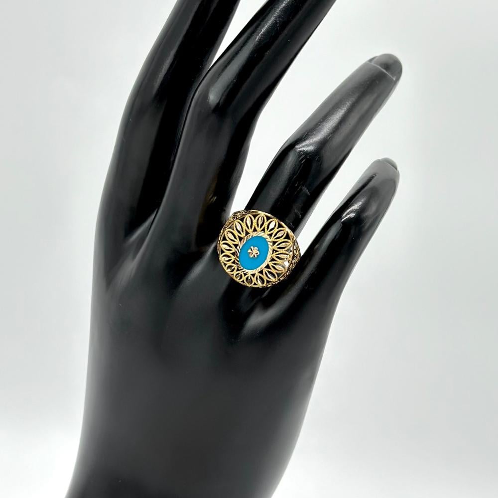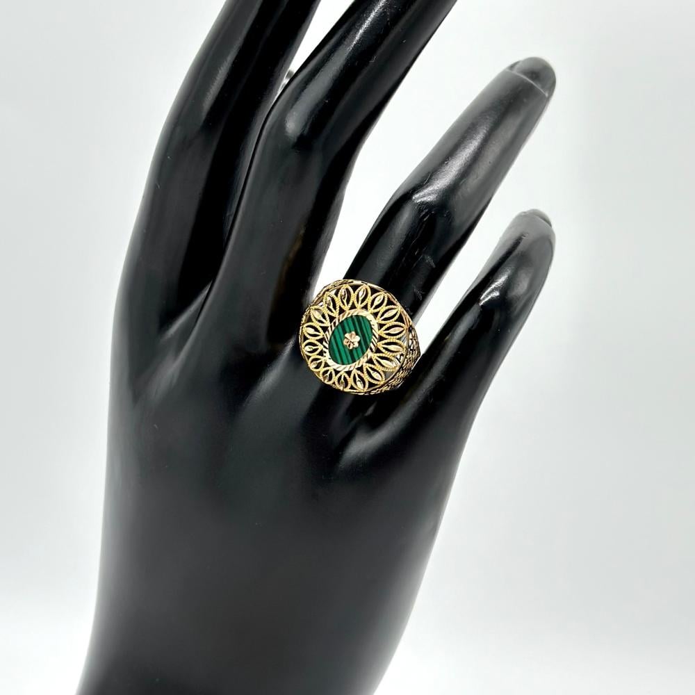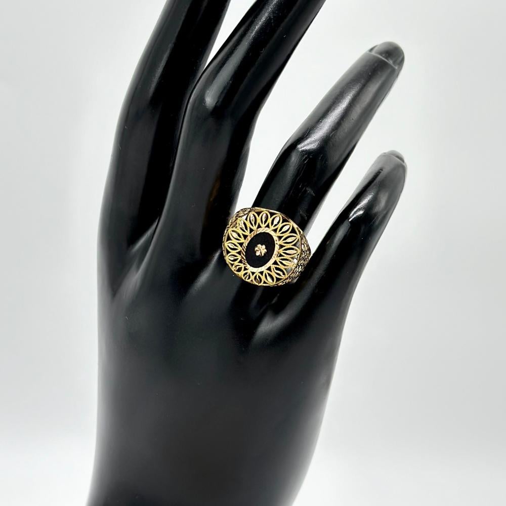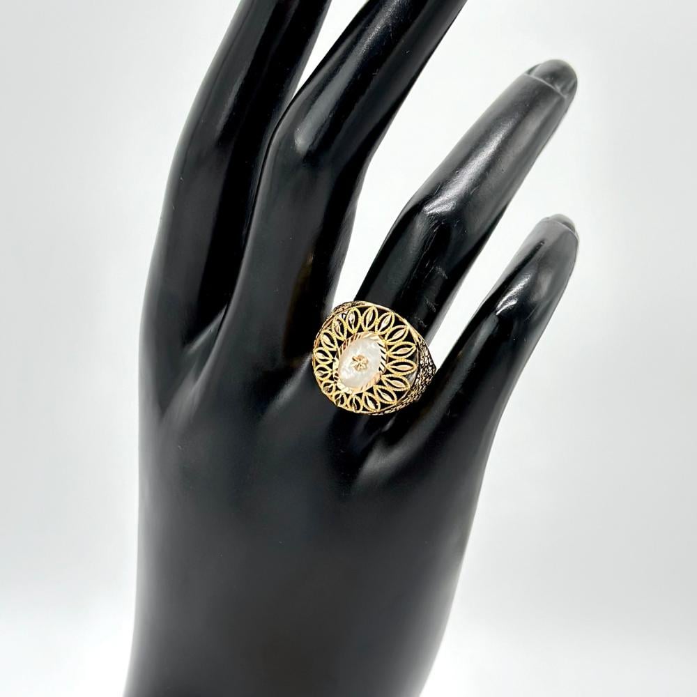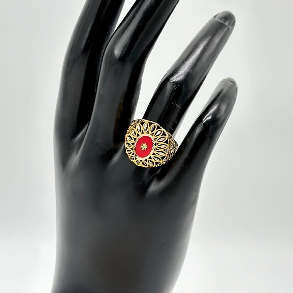 خاتم ذهبي عيار 21، مرصع بنقوش فنية تضفي جاذبية مميزة، ويتزين بحجر صدفي بألوان زاهية، ينبض بأناقة لا مثيل لها، مكملاً لجمال وسحر من ترتديه.
