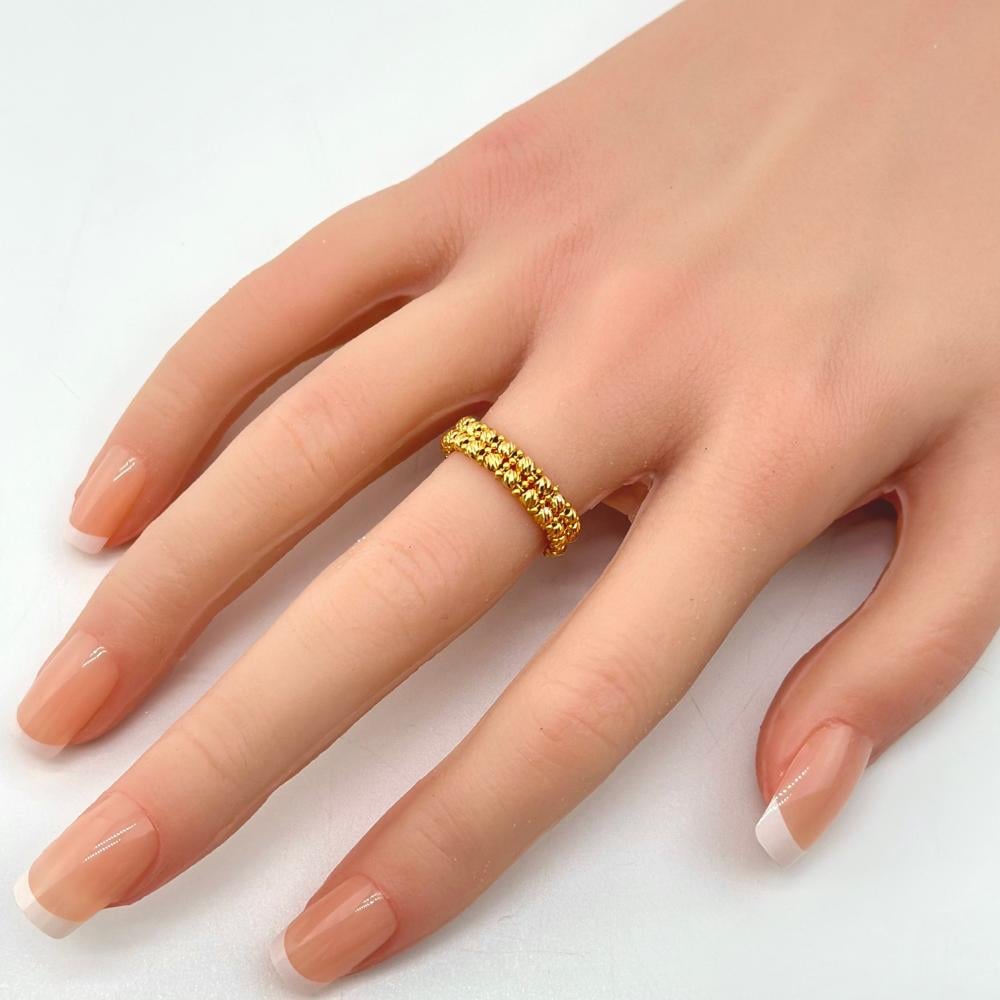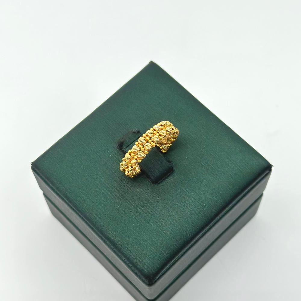 خاتم "الكرات الإيطالية" هو تجسيد للأناقة والرقي مصنوع من الذهب عيار 21, يتكون من مجموعة كرات صغيرة متناظرة باللون الأصفر الدافئ تجذب الأنظار, مصقولة بدقة لتعكس الضوء بشكل إنسيابي ورائع.