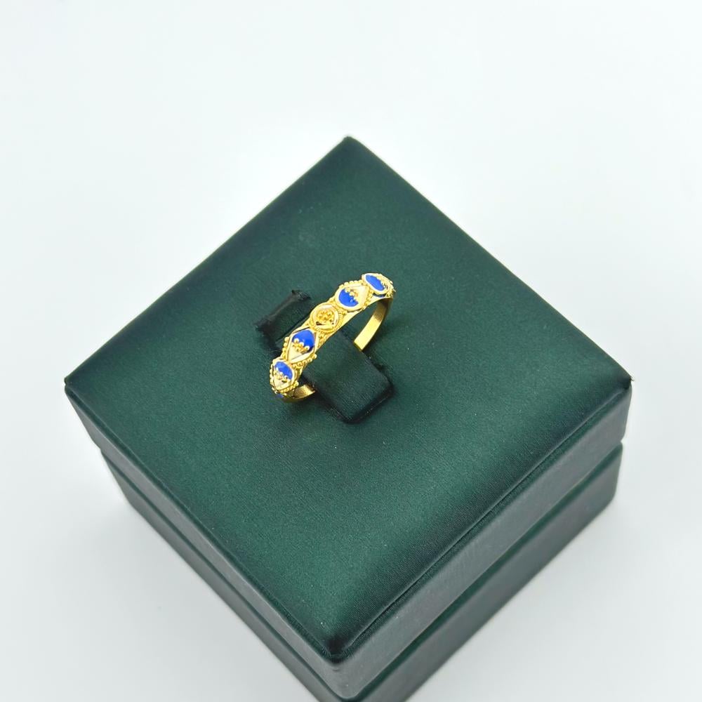 خاتم ذهبي عيار 21 بتصميم فاخر يحمل نقوشاً هندية تقليدية وزخارف مينا ملونة بألوان زاهية. هذا الخاتم يجسد براعة الفن الهندي العريق، ليضيف لمسة ساحرة من الفخامة والجمال الثقافي إلى إطلالتك.