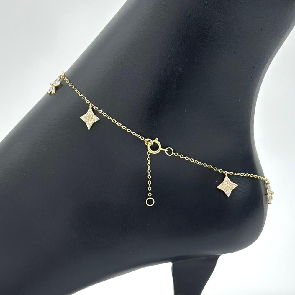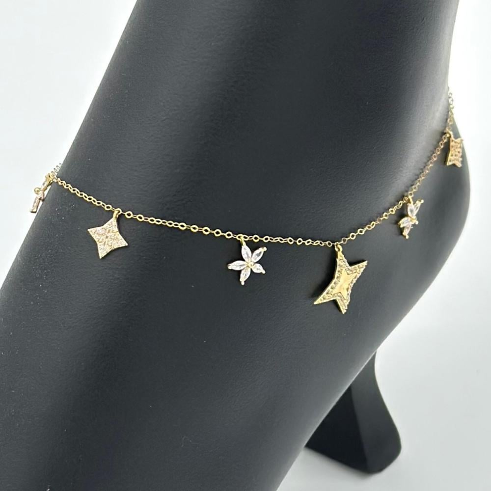 خلخال ذهب عيار 18 بتصميم أنيق، يتألف من أشكال النجوم المتلألئة بالإضافة الى الورود الزركونية الأنيقة بألوان الذهب الأصفر, قطعة فاخرة تجمع بين التنوع والتألق، لتضفي لمسة من الرقي والتفرّد في كل مناسبة.