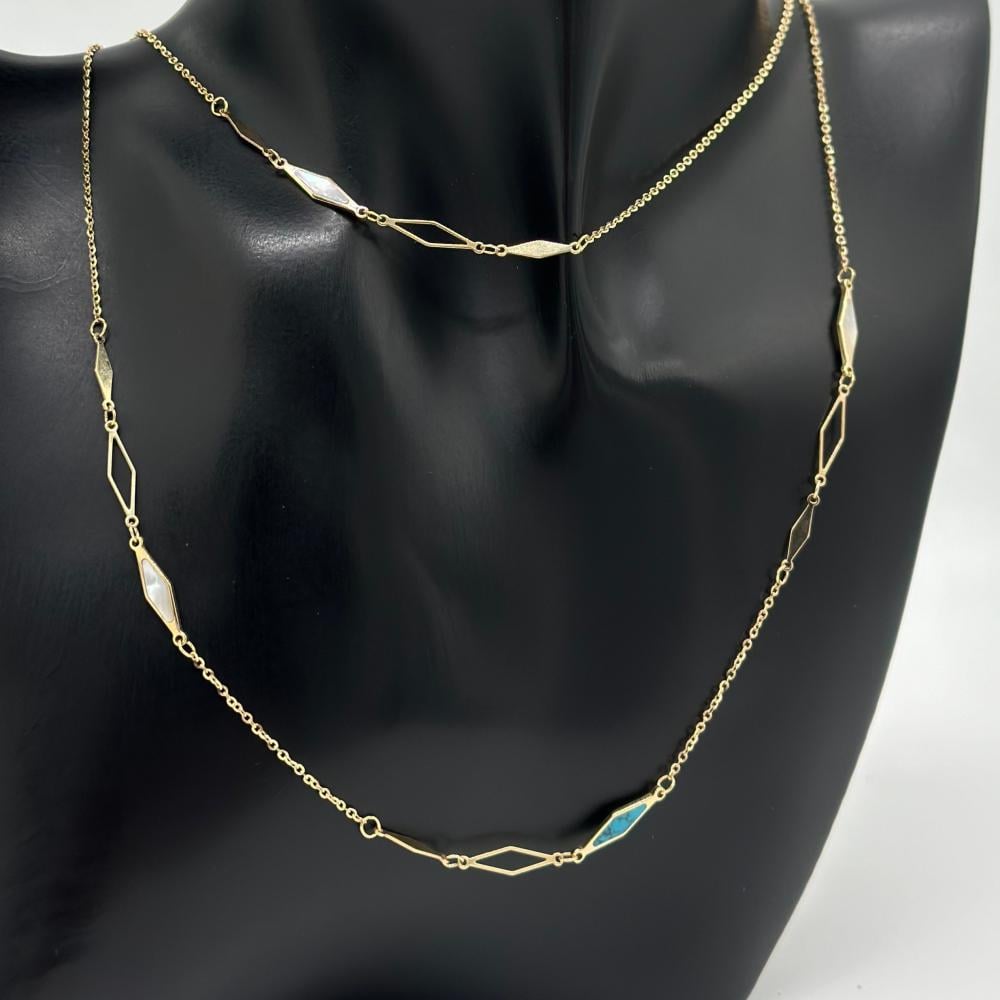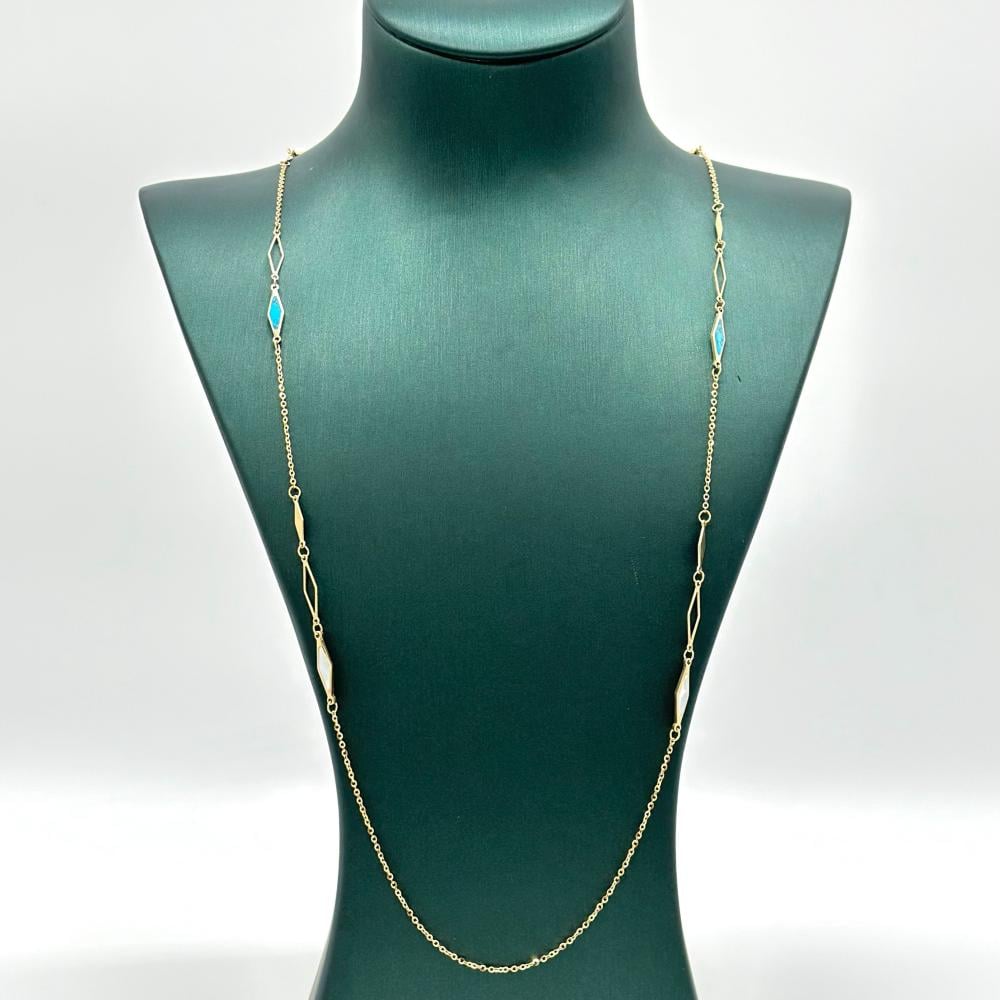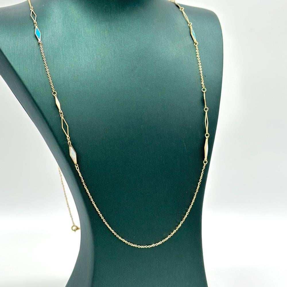 تتألق هذه السبحة الفاتنة بأناقة حول العنق كسلسلة من الذهب عيار 18، محاطة بأشكال مثلثة ساحرة تحمل في داخلها أحجارًا ملونة بألوان المينا. بريق الأحجار الملونة يعكس سحر الطبيعة ورونقها، مما يضفي على هذه السبحة لمسة من الجمال والأناقة التي لا تُضاهى.✨