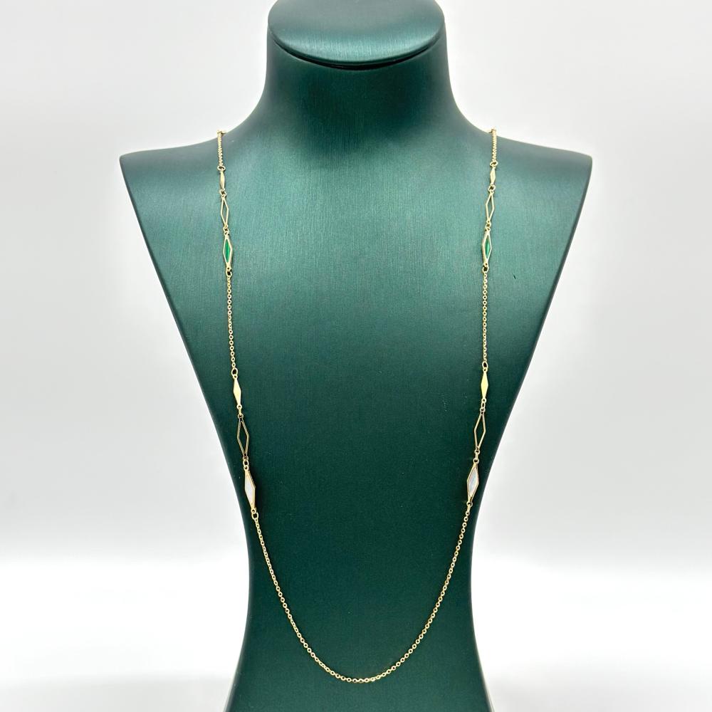 بفخر تتألق هذه السبحة الذهبية عيار 18 حول العنق كسلسلة من الجمال المتلألئ. تتوجها أشكال مثلثة رائعة الجمال، تضم في وسطها أحجار ملونة بألوان المينا. تعكس هذه السبحة أناقةً وفخامةً تتجلى في تفاصيلها الدقيقة، محاكيةً جمال الطبيعة وروعة الفن.✨
