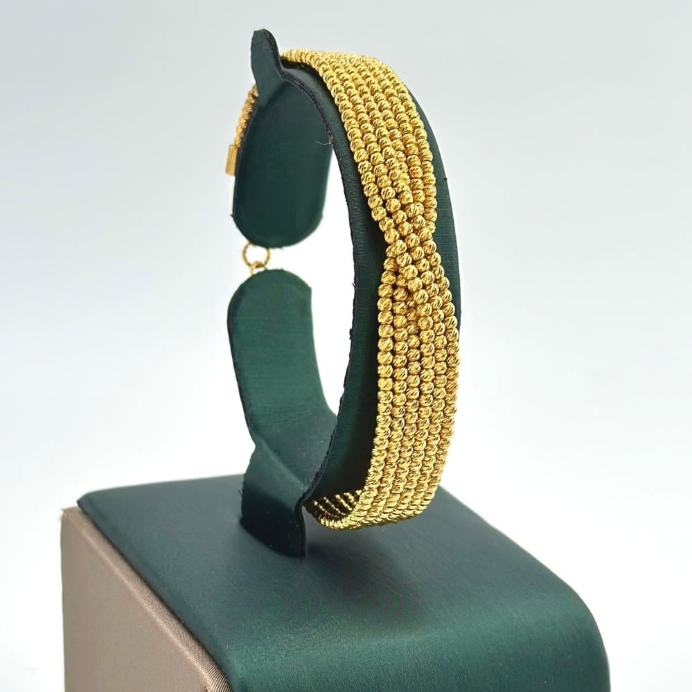سوار ذهب أصفر مع كرات ليزر اللماعة هو تصميم عصري وفاخر يدمج بين الأناقة واللمعان في قطعة واحدة. يتميز السوار بتصميمه الفريد الذي يتكون من كرات صغيرة مُصممة باستخدام تقنية الليزر، مما يمنحها مظهرًا لامعًا وجذابًا. التقنية المستخدمة في صناعة الكرات تمنحها سطحًا ناعمًا ولامعًا يعكس الضوء بشكل رائع، ليضيف لمسة من التألق والفخامة.