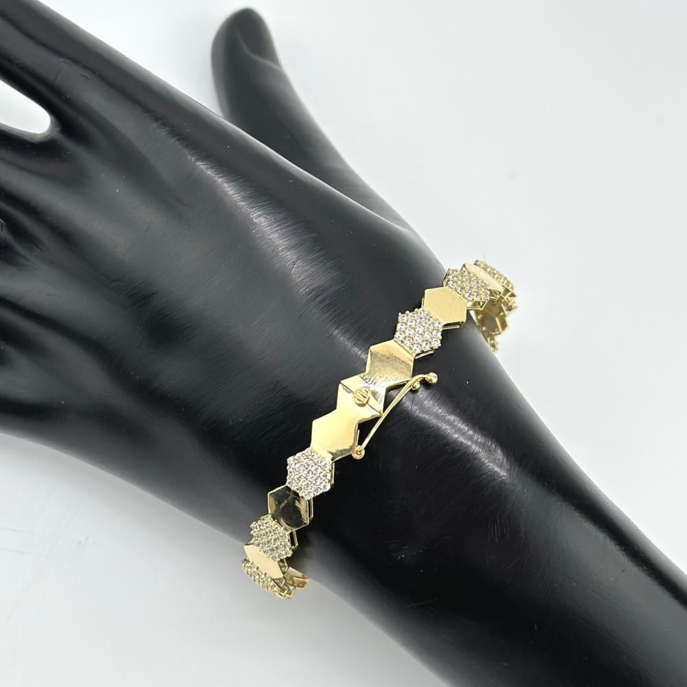 سوارة "مصفوفة الأضواء" سوار فاخر مصنوع من الذهب عيار 18، يتميز بتصميم هندسي فريد على شكل معينات متداخلة، تم تنسيقها بدقة لتشكل لوحة فنية متناسقة, يجمع هذا السوار بين الأناقة الكلاسيكية والابتكار العصري، حيث تم تصميم المعينات بمزيج من الذهب المصقول اللامع والمعينات المرصعة بفصوص الزركون، مما يمنح السوار بُعدًا بصريًا جذابًا.
