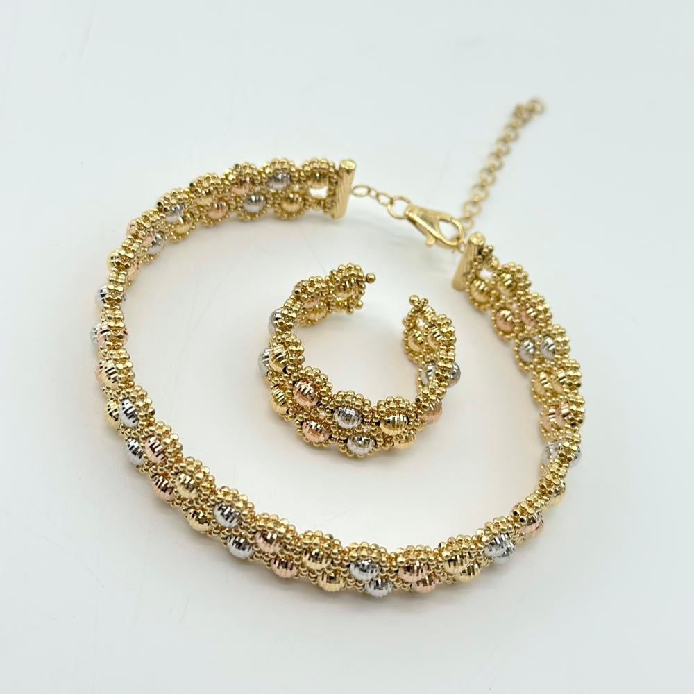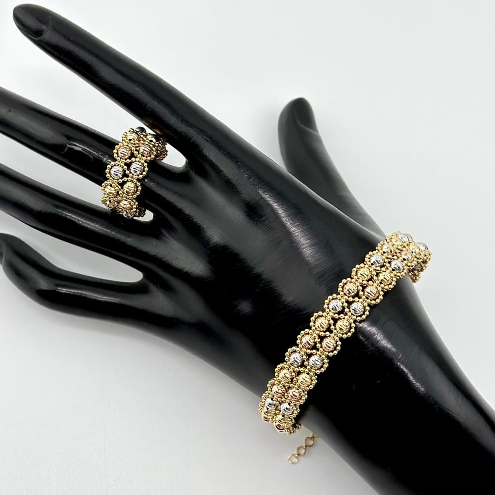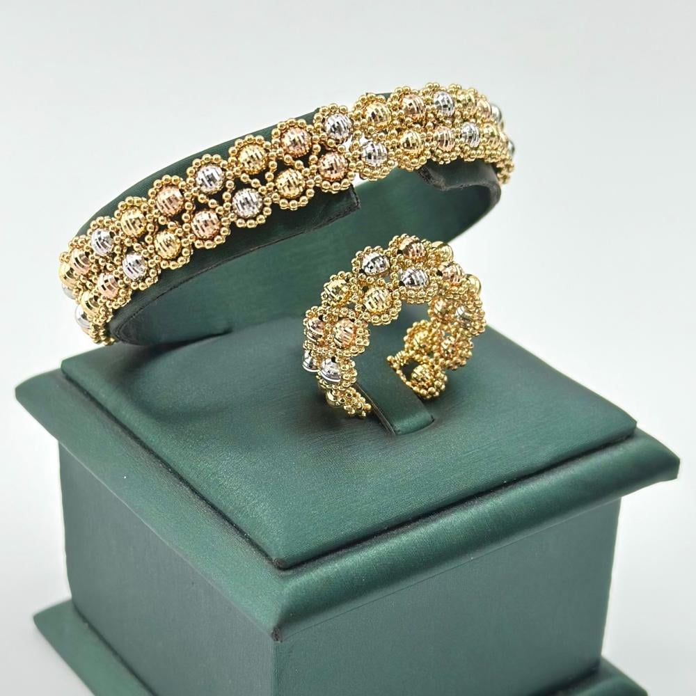 اسوارة مع خاتم ذهب عيار 18 من مجوهرات الشلوي تتميز بتصميم أنيق يجمع بين الكلاسيكية والعصرية. تتألف من كرات ليزر مصفوفة بدقة بالألوان الذهب الأصفر والأبيض والروزقولد، مما يضفي تبايناً جذاباً يلفت الأنظار. هذه الاسوارة الفاخرة تضفي لمسة من الأناقة والرقي، مما يجعلها مثالية للمناسبات الخاصة والإطلالات اليومية.