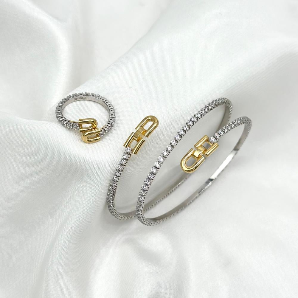 طقم ساحر يتألف من أسوارة رول تنس وخاتم مصنوعين من الذهب الأبيض عيار 18، يزينهما بريق فصوص الزركون المتألقة. تكتمل روعة التصميم بلمسات الذهب الأصفر التي تضفي لمسة دافئة وأنيقة. بفضل مرونتهما المدهشة، يتكيف هذا الطقم الرائع مع أي معصم أو إصبع، ليمنحك إطلالة مبهرة تتناغم بين الفخامة والابتكار في كل مناسبة.✨