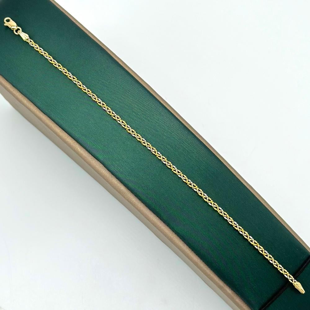 اكتشفي سحر الأناقة مع اسوارة ذهب عيار 18 بخطوط متداخلة من الذهب الأصفر والأبيض. تصميمها الفريد يجمع بين بريق الذهبين في تناغم مثالي، ليضفي على معصمك لمسة من الفخامة والتميز. هذه الاسوارة هي الخيار الأمثل لإبراز جمالك وأناقتك في كل مناسبة.✨