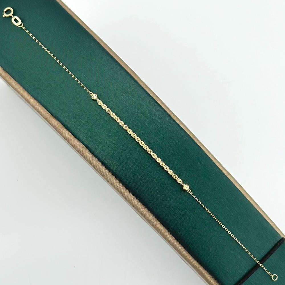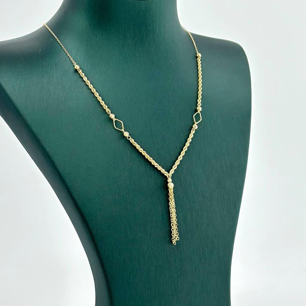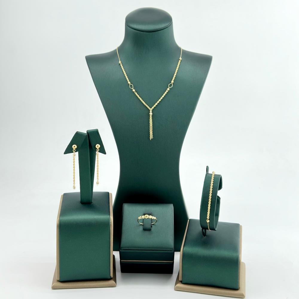 طقم ذهب أصفر عيار 18 يأتي بسلسال مبروم أنيق، مطعّم بكرات الليزر اللامعة. يجمع هذا التصميم بين البساطة والفخامة، ليضفي لمسة عصرية وجذابة على إطلالتك.