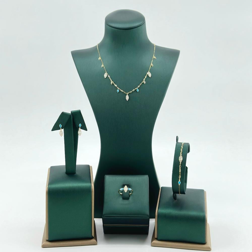 طقم ذهب ناعم بوزن 3.4 جرام من عيار 18، يدمج بين ألوان المينا الحيوية وقصّات الباقييت اللامعة في تصميم فني جذّاب. مثالي لمحبات التفاصيل الراقية والإطلالة اليومية الهادئة، ويتميّز بخفة وزنه وأناقة لمّاحه تُبرز شخصيتك بكل بساطة.