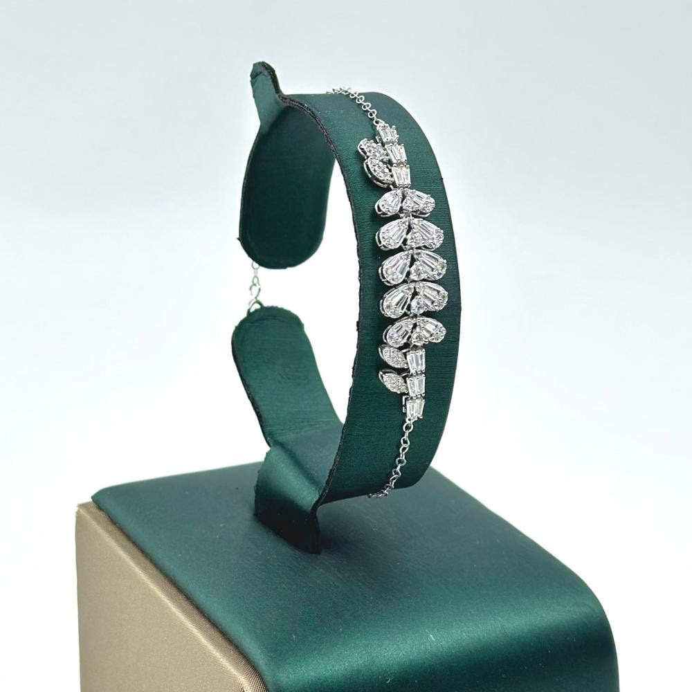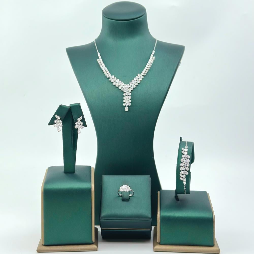 طقم الذهب الأبيض عيار 18 بتصميم قطرات أنيقة، يزينه فصوص الزركون البراقة وقصات الباقيت اللامعة. تجمع هذه القطرات بين بريق الألماس ورونق الأشكال الأنيقة، لتضفي لمسة من السحر والرقي على إطلالتك. قطعة مثالية تعبر عن الفخامة والأنوثة بكل تفاصيلها.