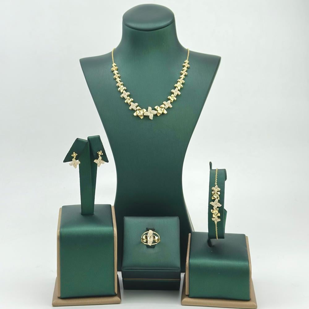 طقم ذهب "الوردة الساحرة" بوزن 12.3 جرام وعيار 18، مستوحى من جمال الزهور ولمسة الأنوثة الناعمة. تصميمه الفريد على شكل وردة مع قصات الزركون المتألقة, يبرز بتفاصيل الوردة اللامعة التي تضيف لمسة فاخرة وجاذبية خاصة لأي إطلالة، سواء للزيارات أو المناسبات. خيار مثالي لكل من تبحث عن طقم ذهبي يلفت الأنظار بأسلوب راقٍ.
