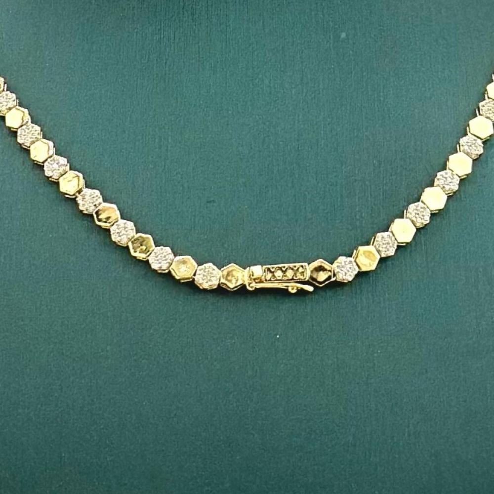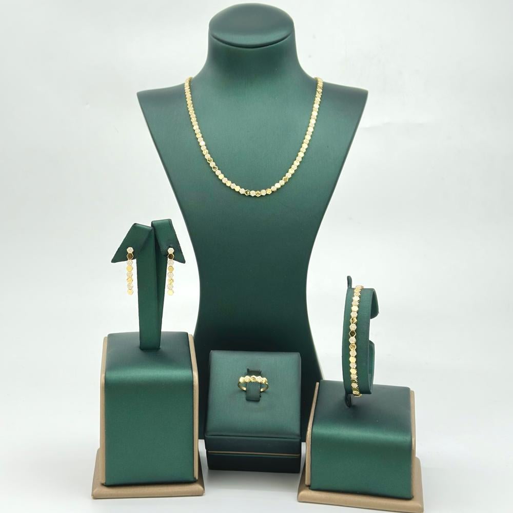 طقم ذهب بوزن 17.6 جرام من عيار 18، بتفاصيل ناعمة مستوحاة من بريق الألماس، يجمع بين الجاذبية والعملية في تصميم يليق بكل لحظة. اللمسات اللامعة تضيف لمسة فخمة بدون مبالغة، والطقم مصمم ليناسب المناسبات الخاصة والإطلالات اليومية الراقية.