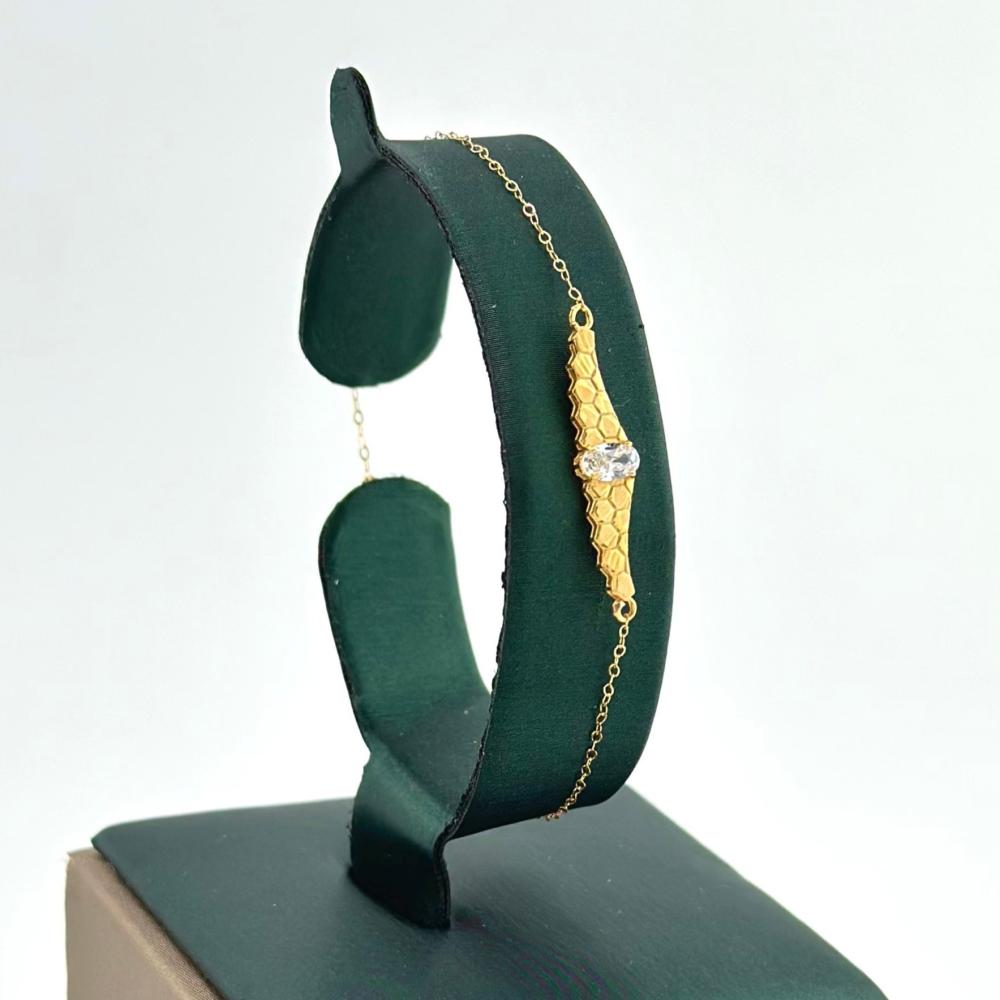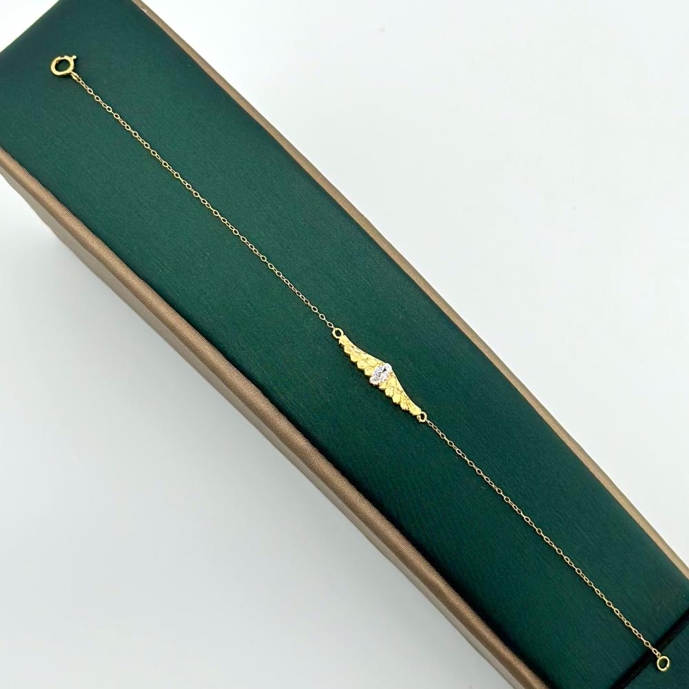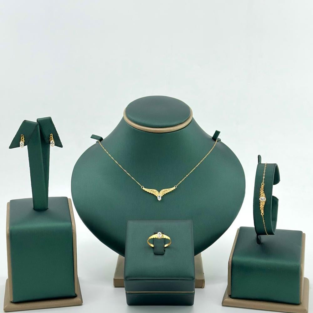 طقم "جناح الصقر " مصنوع من الذهب عيار 21, يتميز التصميم بدقة متناهية حيث تظهر تفاصيل الريش بشكل بارز ودقيق, منحوت بخطوط انسيابية تمنح الطقم مظهراً طبيعياً وحيوي, الأجنحة تنساب بإنحنائات ناعمة لتشكل قوساً انيقاً يعكس إحساساً بالحركة والطيران, يتوسط الطقم فص جميل على شكل بيضاوي باللون الأبيض.