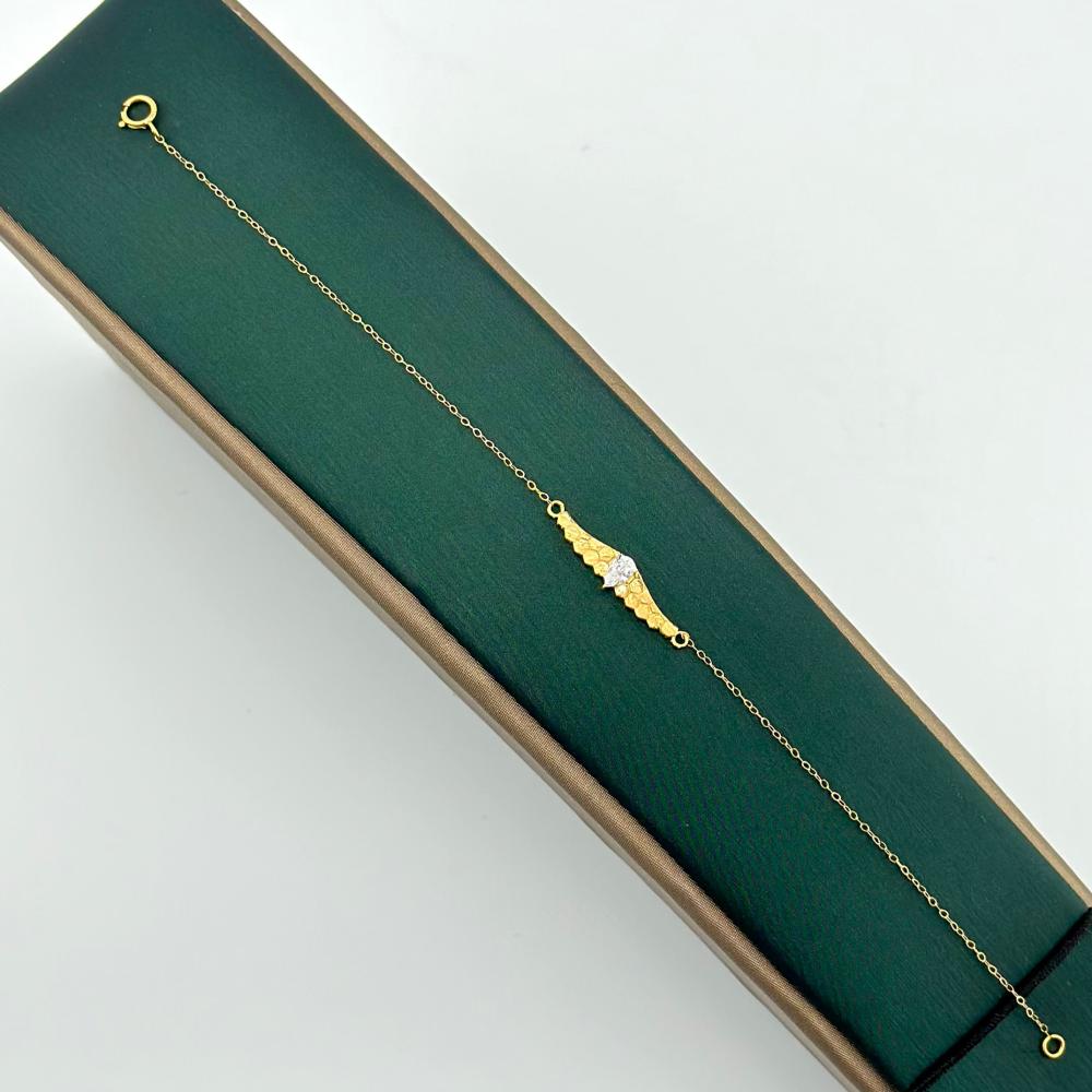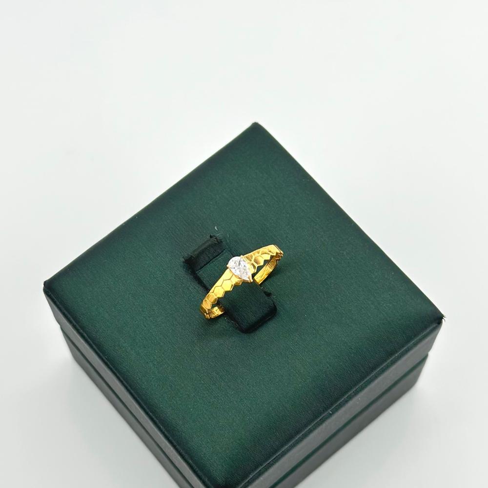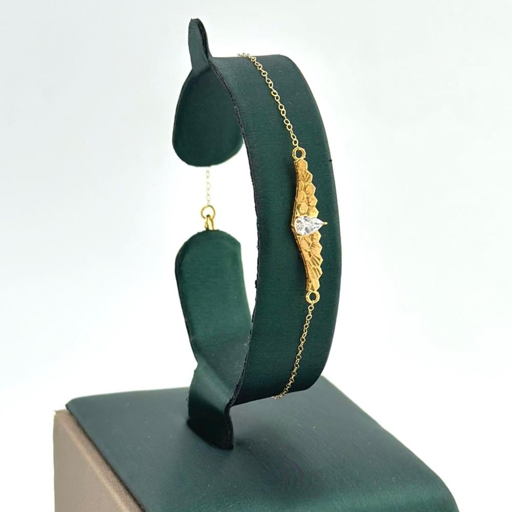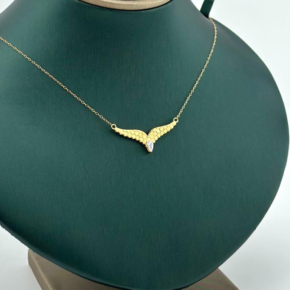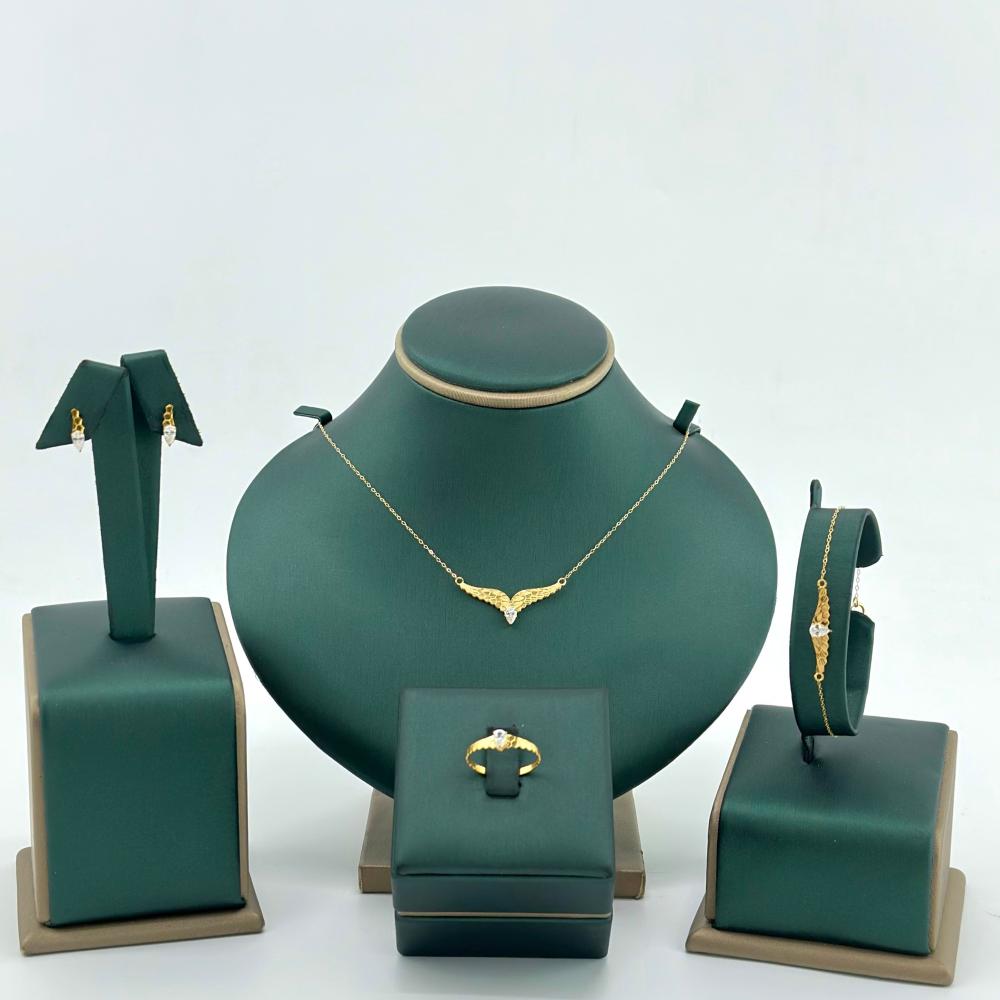 طقم "جناح الصقر " مصنوع من الذهب عيار 21, يتميز التصميم بدقة متناهية حيث تظهر تفاصيل الريش بشكل بارز ودقيق, منحوت بخطوط انسيابية تمنح الطقم مظهراً طبيعياً وحيوي, الأجنحة تنساب بإنحنائات ناعمة لتشكل قوساً انيقاً يعكس إحساساً بالحركة والطيران, يتوسط الطقم فص جميل على شكل دمعة باللون الأبيض.