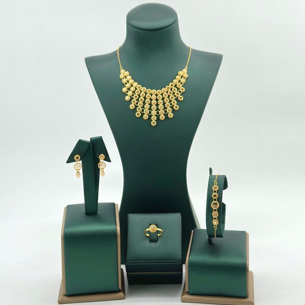 طقم ذهب عيار 21 هو مجموعة مجوهرات فاخرة ومتقنة التصميم، تعكس الفخامة والأنوثة بأدق التفاصيل. يتكون الطقم من قلادة، أقراط، خاتم، وأسورة، جميعها مصممة لتبرز جمال الذهب الأصفر وتضفي لمسة من الرقي.