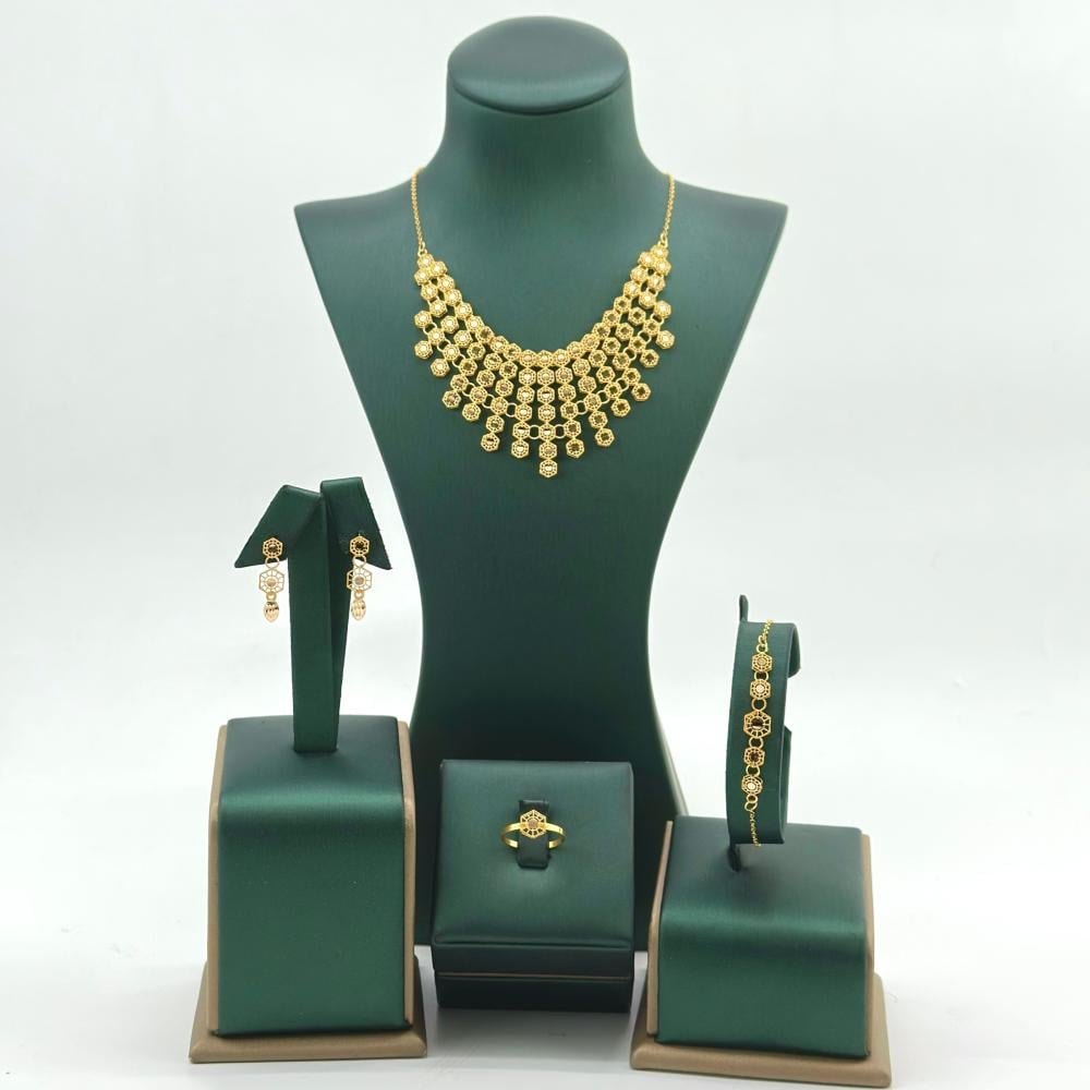 طقم ذهب عيار 21 هو مجموعة مجوهرات فاخرة ومتقنة التصميم، تعكس الفخامة والأنوثة بأدق التفاصيل. يتكون الطقم من قلادة، أقراط، خاتم، وأسورة، جميعها مصممة لتبرز جمال الذهب الأصفر وتضفي لمسة من الرقي.