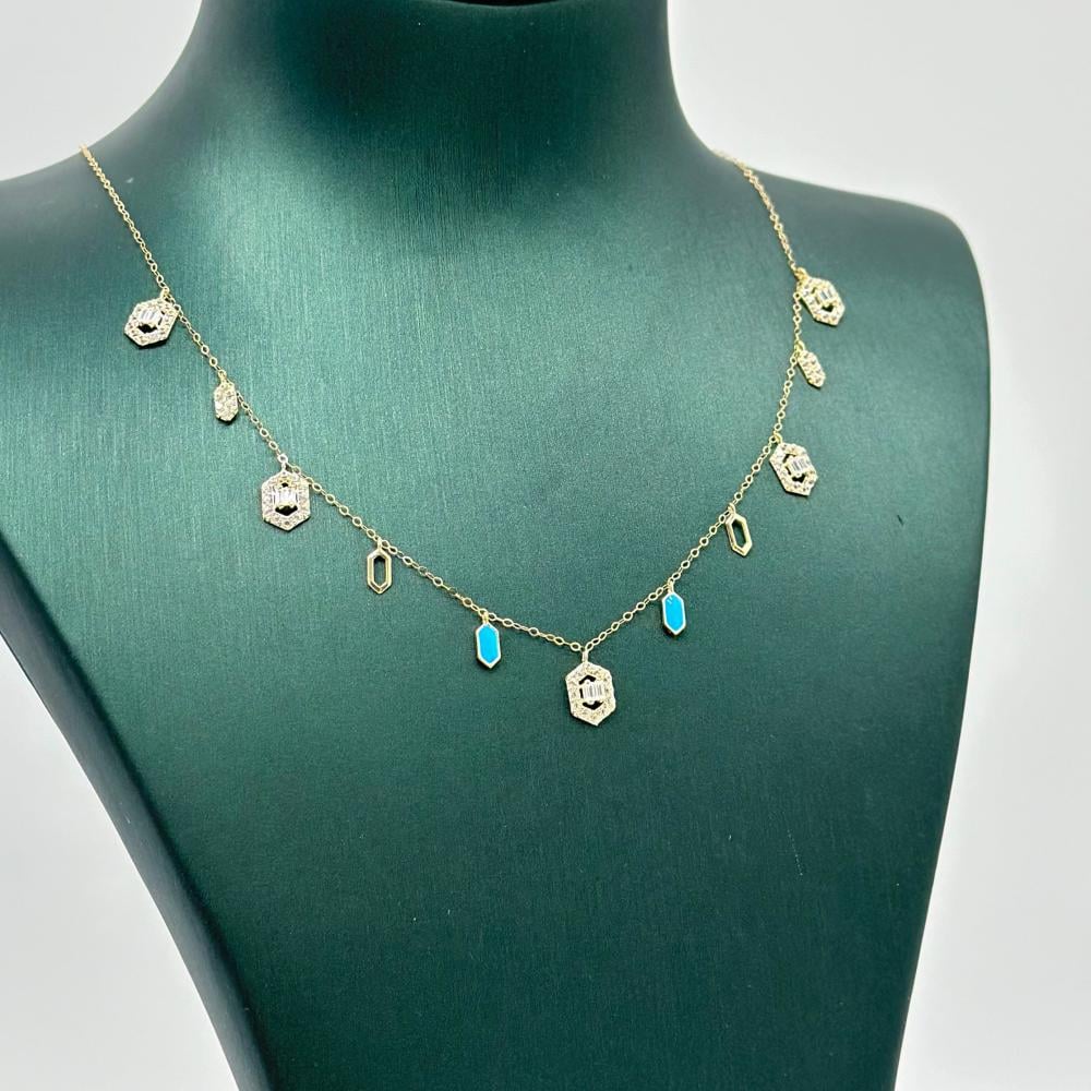 طقم ذهبي أصفر عيار 18 بتصميم إيطالي من مجوهرات الشلوي يتميز بجودته العالية وتفاصيله الدقيقة. تتميز كل قطعة في الطقم بألوان المينا الساحرة وفصوص الزركون المتلألئة وقصات الباغيت الفاخرة. إنها مجموعة فاخرة تضفي لمسة من الأناقة والفخامة على إطلالتك.