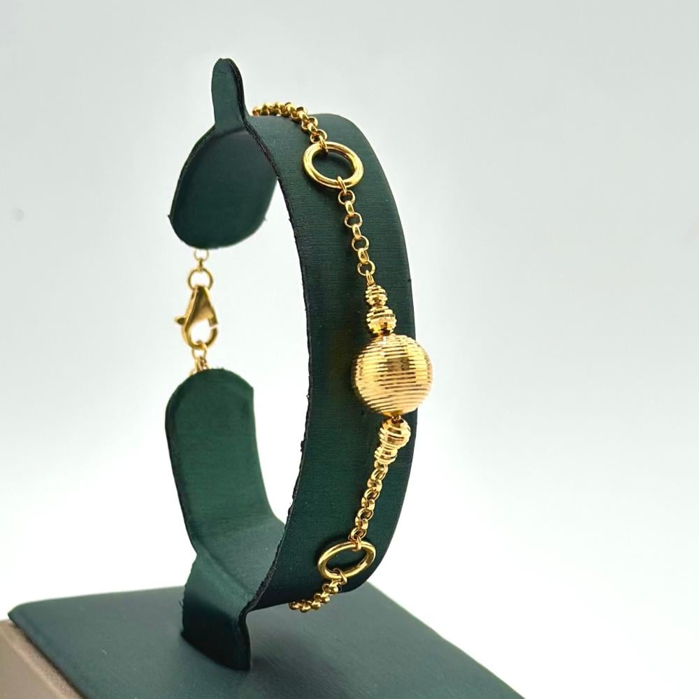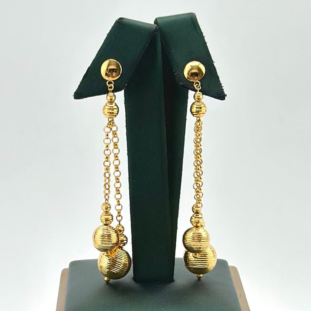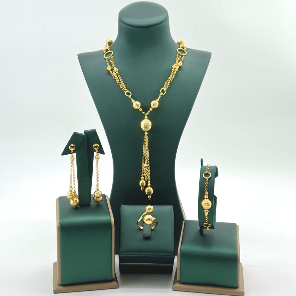 طقم ذهب عيار 21 بتفاصيل ناعمة وكورات ليزر تلمع مع كل حركة. تصميمه بسيط وراقي، ووزنه 26.7 جرام يعطيك حضور أنثوي واضح بدون مبالغة. يناسبك للبس اليومي أو كهديّة تفرّح القلب، خصوصًا إذا كنتِ من محبّات اللمسات الخفيفة اللي ما تمر مرور الكرام.