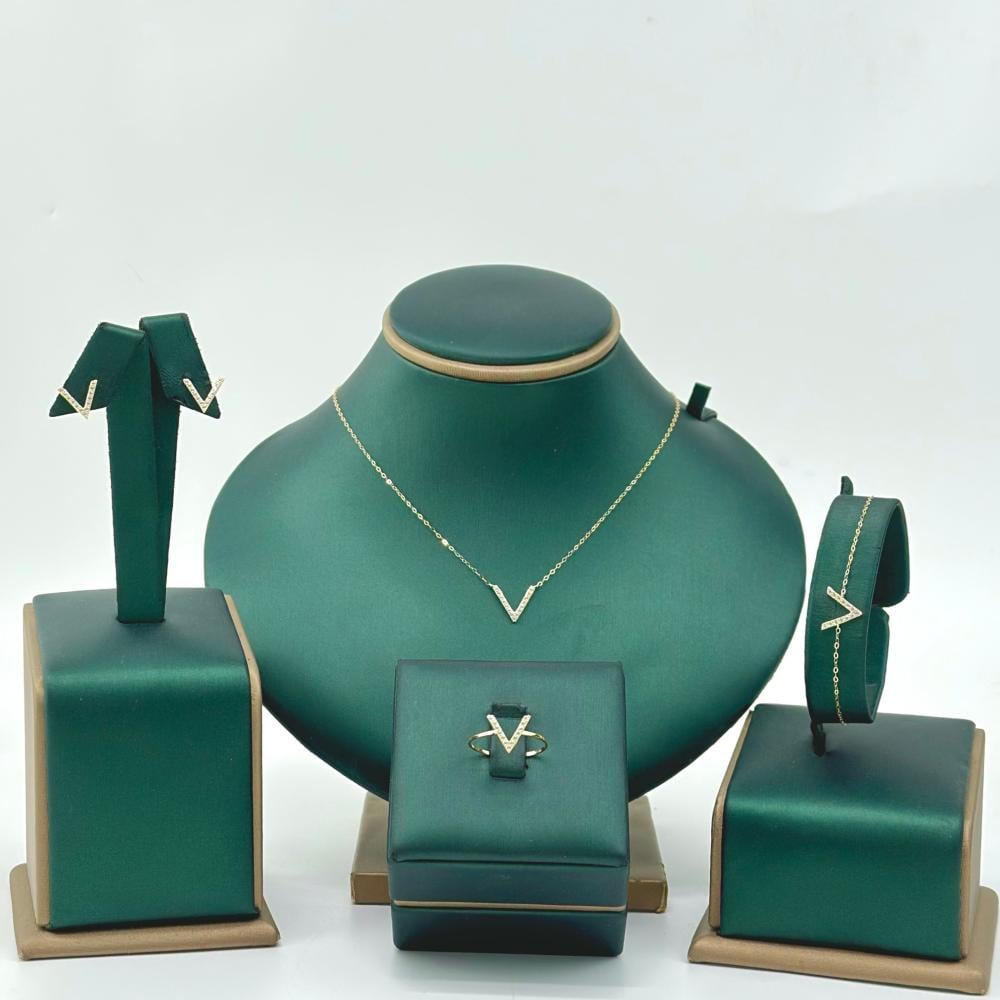 طقم ذهب ناعم بلمعة الماس، عيار 18 ووزن خفيف 2.2 جرام، مثالي للبس يومي أو هدية أنيقة. تصميم عصري يوحي بالفخامة رغم الوزن الخفيف، يناسب المرأة الراقية الباحثة عن لمسة ذهبية بسيطة ومميزة.