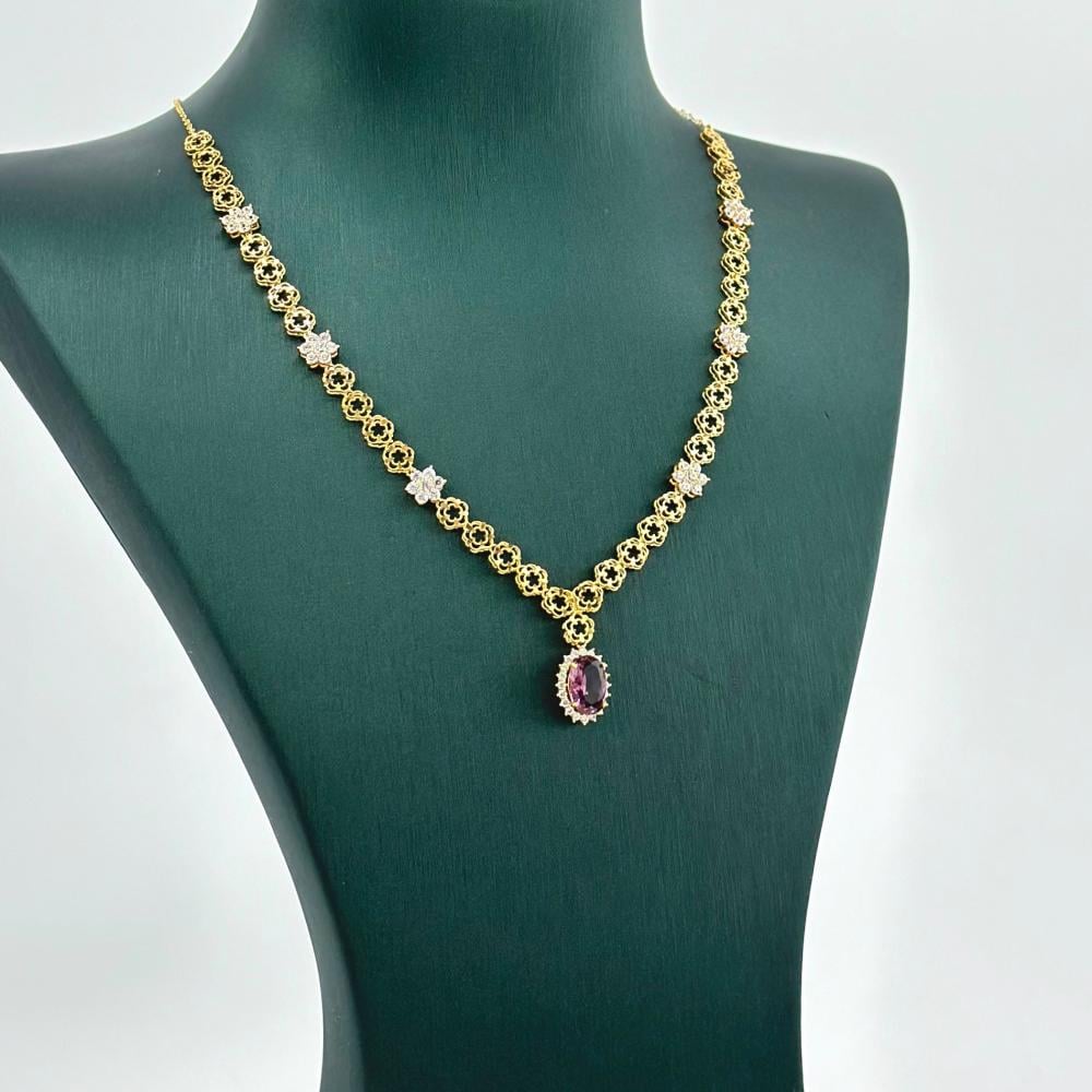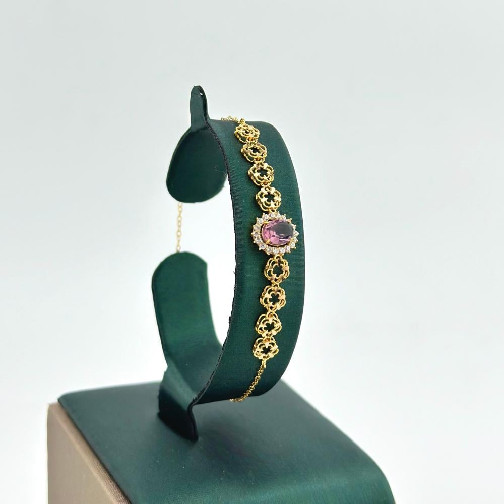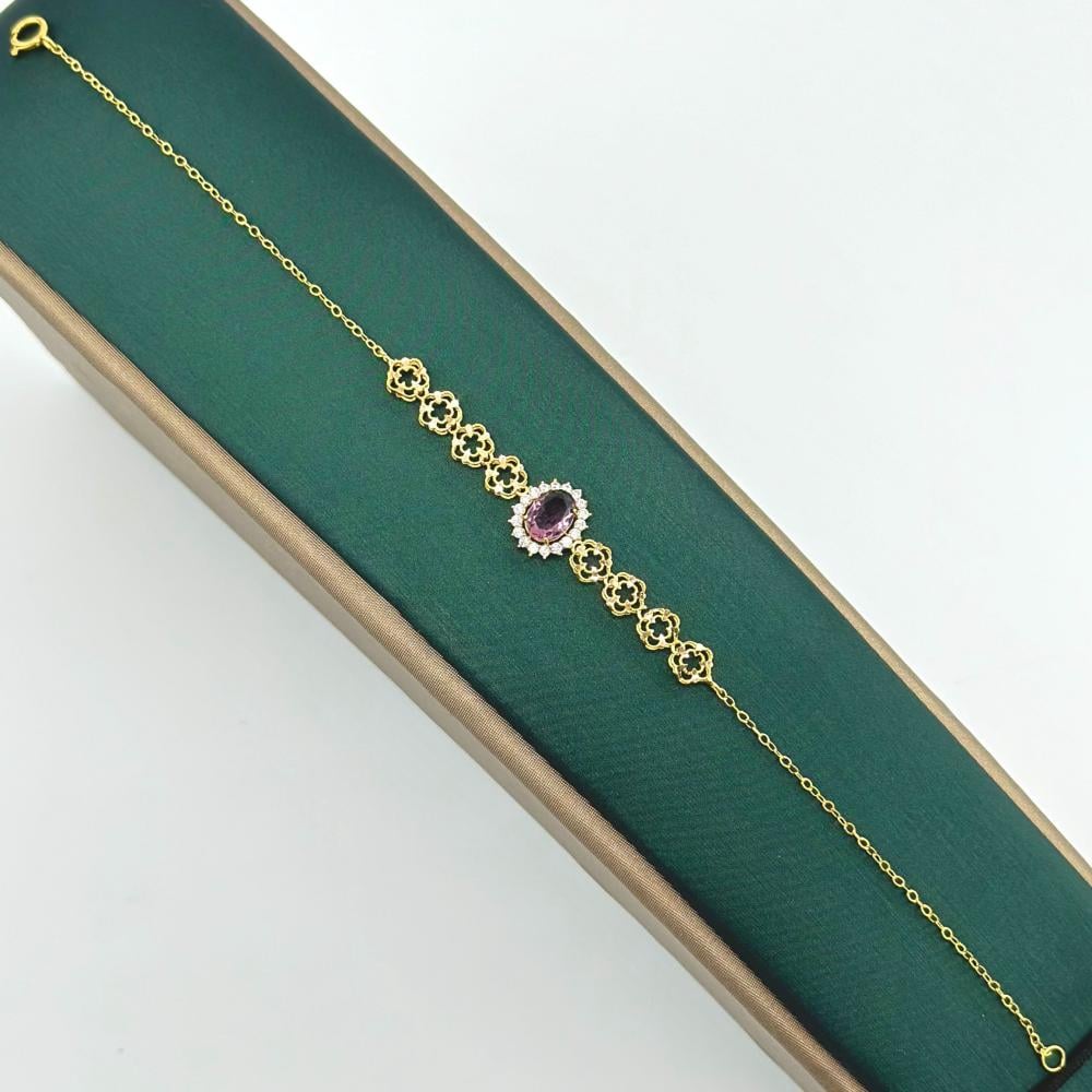 طقم يشع بألق الجمال والحيوية، يمزج بين روعة الذهب وبريق الحجر المتلألئ والزريكون. كقلب للطقم، ينبض الحجر بلونه الموف بالحياة والثراء، معبأ بالأمل والتجدد. يتألق كل قطعة كوردة متفتحة، تنبعث منها شذى الجمال والنضارة. هو تعبير عن الحياة والحماس، وعن فخامة وجاذبية لا مثيل لهما.✨
