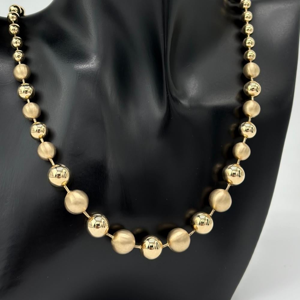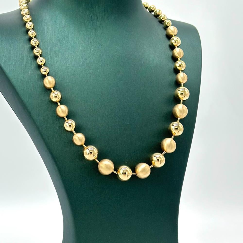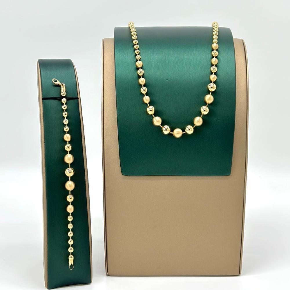 اكتشفي أناقة لا مثيل لها مع طقم الذهب العيار 18 الذي يتميز بتداخل ساحر بين الكرات الذهبية المختلفة الأحجام، بعضها مطفي ليعكس نعومة وجمال الغموض، والبعض الآخر لمّاع ليضيء كل لحظة بأناقة خالدة. يجمع هذا الطقم بين الأنوثة والرقي ليكون الرفيق المثالي في كل مناسباتك.✨