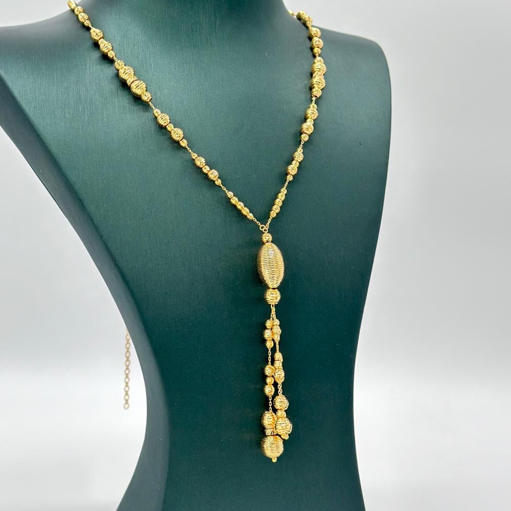 تألقي بإطلالة ملكية مع طقم مجوهرات الشلوي من ذهب أصفر عيار 21. يضم الطقم عقداً وأسوارة وخاتم وحلق، مزيناً بكرات النانو وتصاميم بيضاوية-دائرية تضفي سحراً ورقياً فريداً. هذا الطقم الفاخر يجسد الفخامة والجمال، ليمنحك إطلالة استثنائية في كل مناسبة.✨