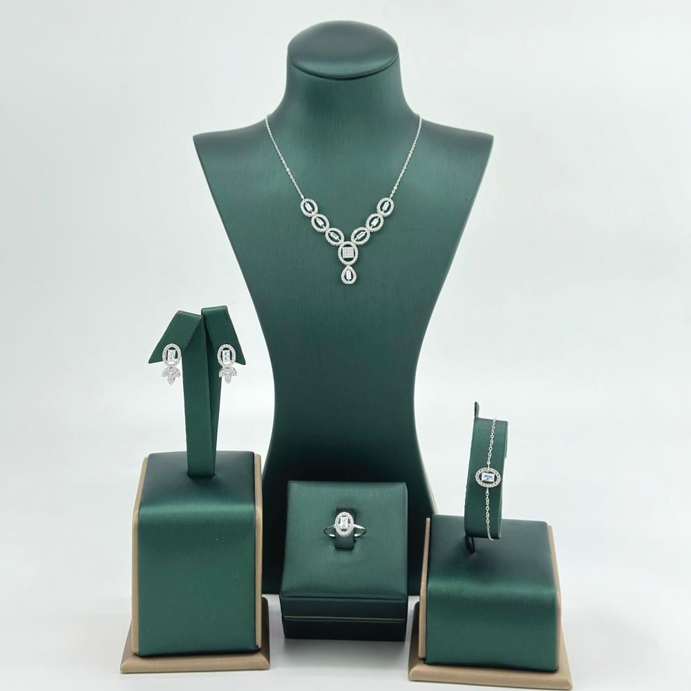 طقم الذهب الأبيض عيار 18 بتصميم أنيق، يزينه فصوص الزركون البراقة وقصات الباغيت اللامعة. يجمع هذا الطقم بين بريق الألماس ورونق الأشكال الأنيقة، ليضفي لمسة من السحر والرقي على إطلالتك. قطعة مثالية تعبر عن الفخامة والأنوثة بكل تفاصيلها.