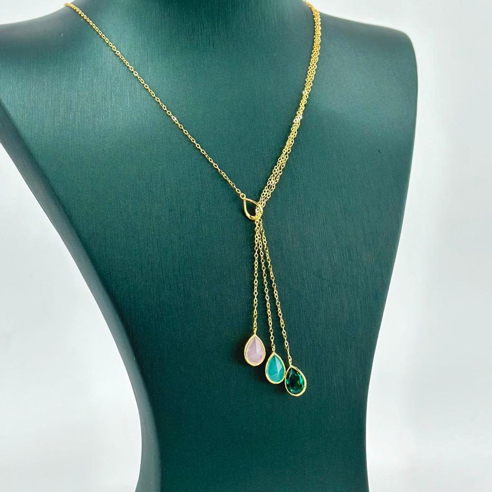 قلادة ذهبية مميزة تتألق بأحجار ملونة تضفي عليها بريقاً وجمالاً لا مثيل له، بالإضافة إلى قطعة متحركة فريدة تتحكم في مركز القلادة، مما يمنحها لمسة من الأناقة الفاخرة والابتكار. تعكس هذه القطعة الفريدة الفخامة والأناقة في تصميمها وتفاصيلها، وتجسد فن الصياغة بأعلى درجاته.✨