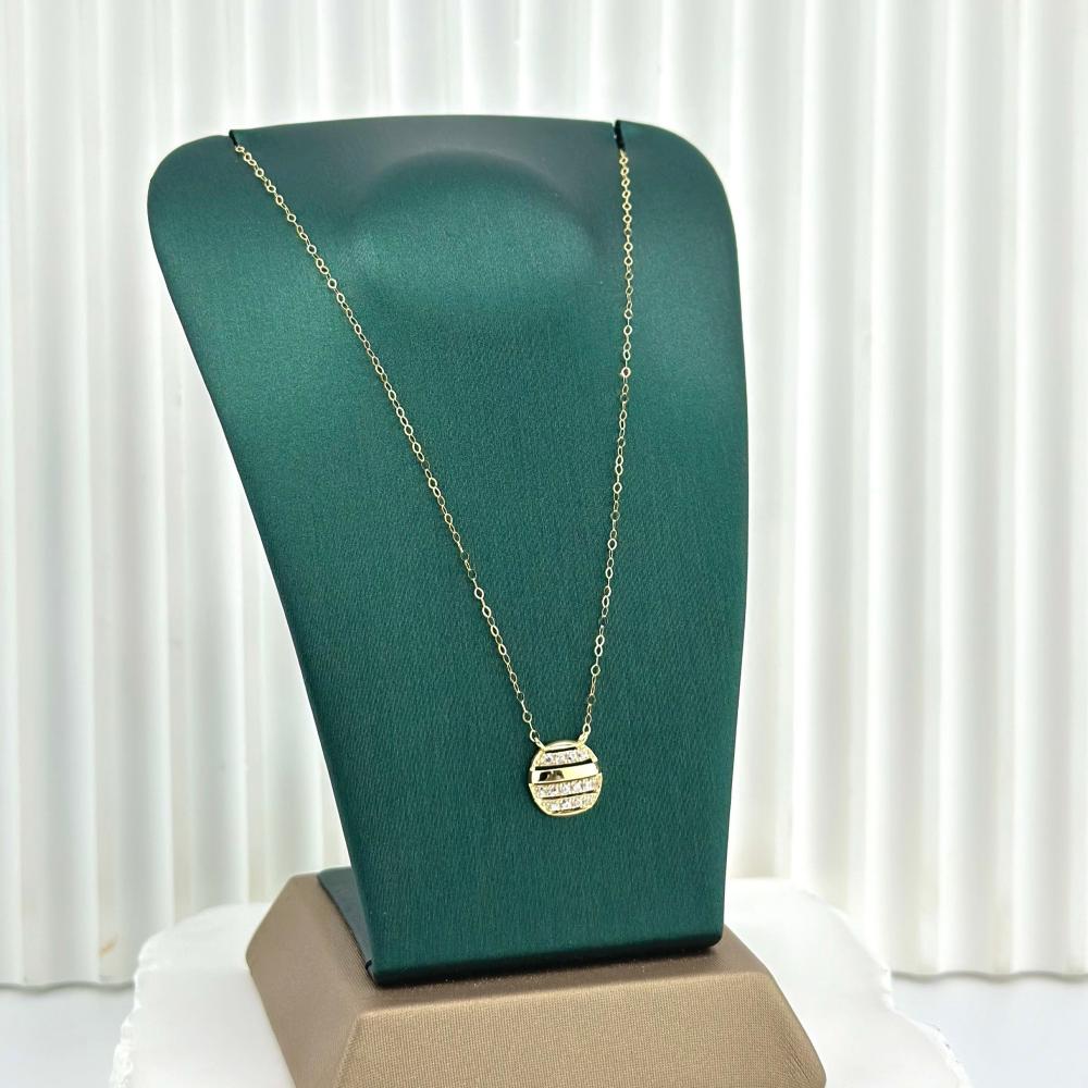 بفضل تركيبته الدقيقة وتفاصيله الرائعة، يضفي هذا العقد لمسة من الأناقة والجمال الخالص على عنقكِ، حيث يمزج بين سحر الذهب عيار 18 وبريق الزريكون الأنيق بتصميم يشبه بريق الالماس بكل تفاصيله.✨