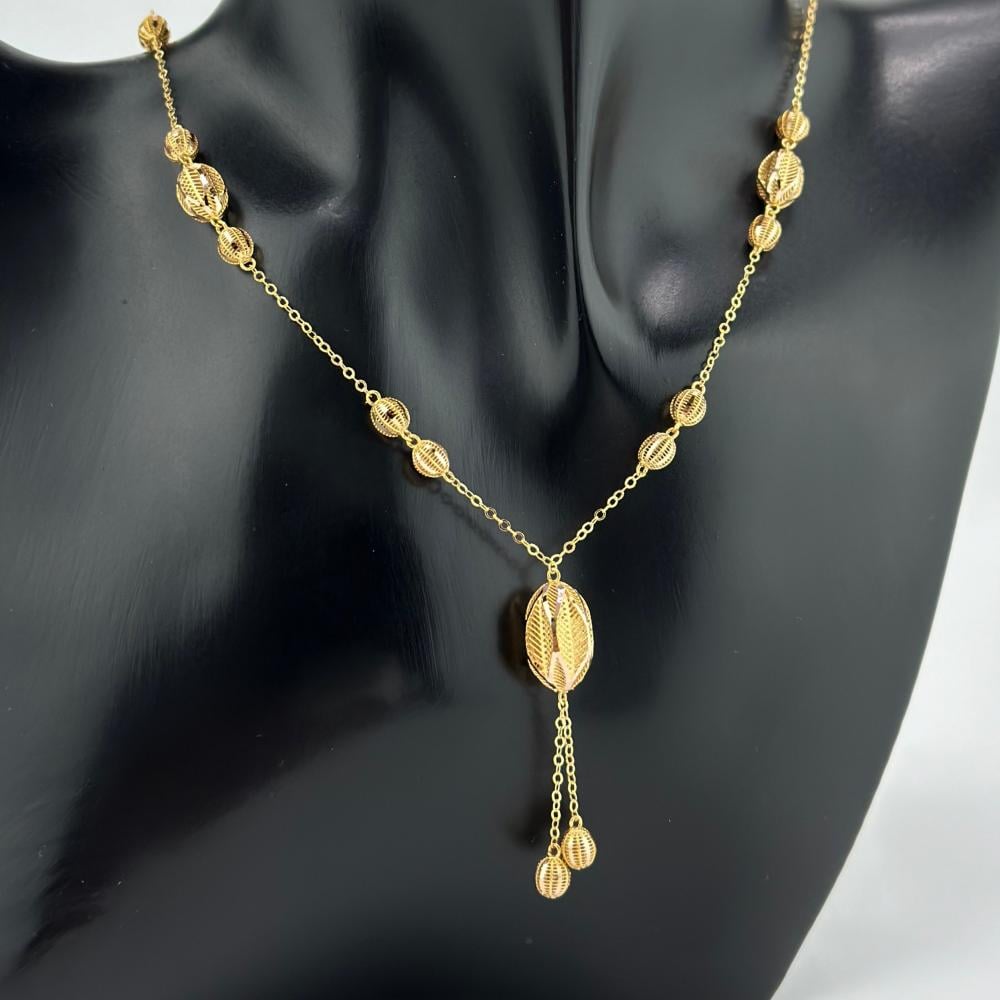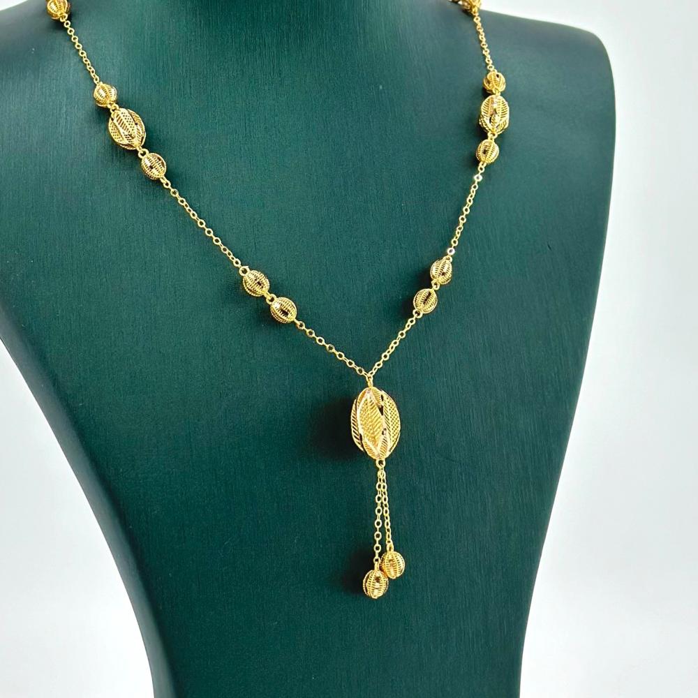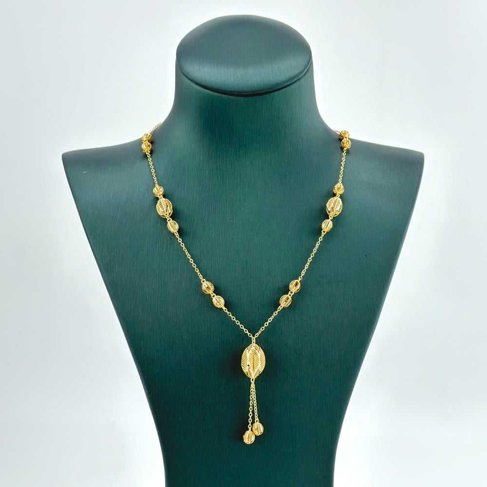 عقد من الذهب الأصفر عيار 21 من مجوهرات الشلوي، يتألق بتصميم شرقي ساحر يحمل كرات بيضاوية مصقولة بعناية. قطعة تنبض بالأصالة والفخامة، تمنحك حضوراً مميزاً يعكس جمال التراث الشرقي بروح عصرية، لتكملي إطلالتك بلمسة من السحر والتألق.