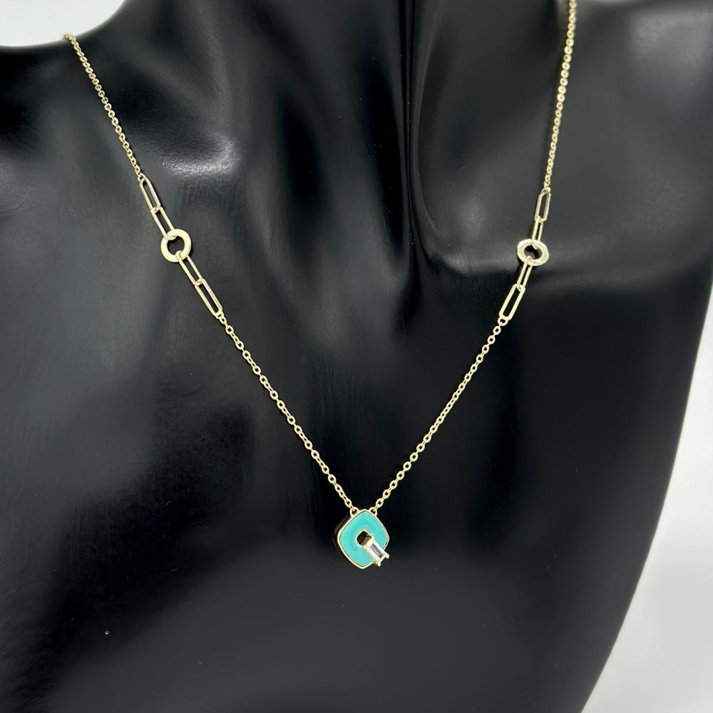 تصميم أنيق يجمع بين ألوان المينا المتنوعة بأشكال هندسية متناغمة، مما يضفي عليها لمسة من الحيوية والأناقة. يمكن لهذا العقد أن يكون إضافة مثالية لأي مظهر، سواء كان للنهار أو المساء، مع إبراز جمال وسحر صاحبته.
