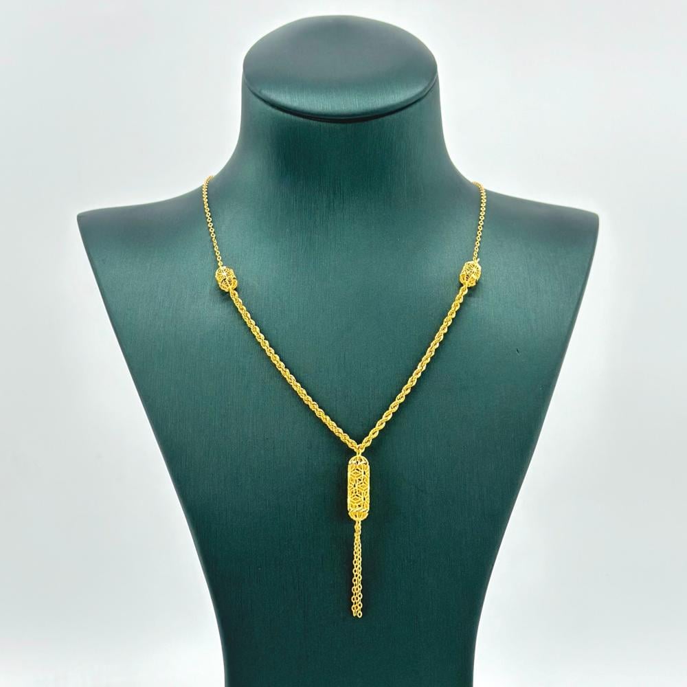 هذا العقد الذهبي يحمل في طياته سرًّا خاصًّا، فهو ليس مجرّد مجوهرات بل هو حكاية حبٍّ مترفة. يشع بريقه اللامع كأنه نجمة من السماء، مليء بالحنان والدفء الذي يجمع بين القلوب. تصميمه الرائع يعكس جمال العاطفة وعمق المشاعر، مع سلسلته المبرومة التي تمثل رباطًا قويًا لا يتأثر بتقلبات الزمان والمكان.✨