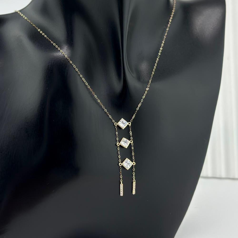 عقد عيار 18 يتألق بتصميم معينات متتالية تحوي فصوص معينة واسفل العقد يحوي فصوص الزركون اللامعة، يجمع بين الأنوثة والفخامة في قطعة واحدة رائعة. 💫