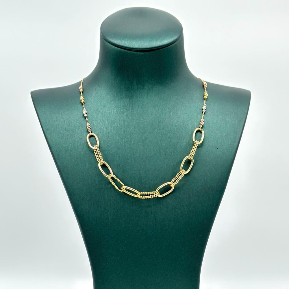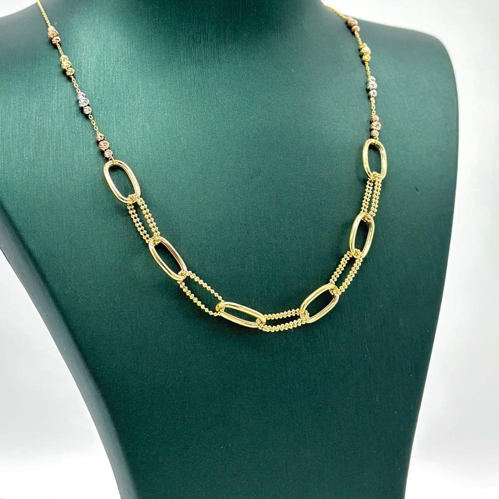 على مساحة العقد الفريد من نوعه، تتناغم الاشكال البيضاوية بتنوعها و جمالها لتخلق توازناً ساحراً. تبرز الاشكال البيضاوية ببريقها المطفي ولونها الذهبي الفاتح، وتلفت الأنظار بسحرها الخاص، بينما تضيء كرات الليزر بلمعانها من الذهب الأصفر، مما يضفي على العقد تألقاً متجدداً وفريداً. هذا التنوع في الألوان يعكس جمال الحياة وتنوعها، مما يمنحك إطلالة متميزة ومفعمة بالأناقة والجاذبية.✨