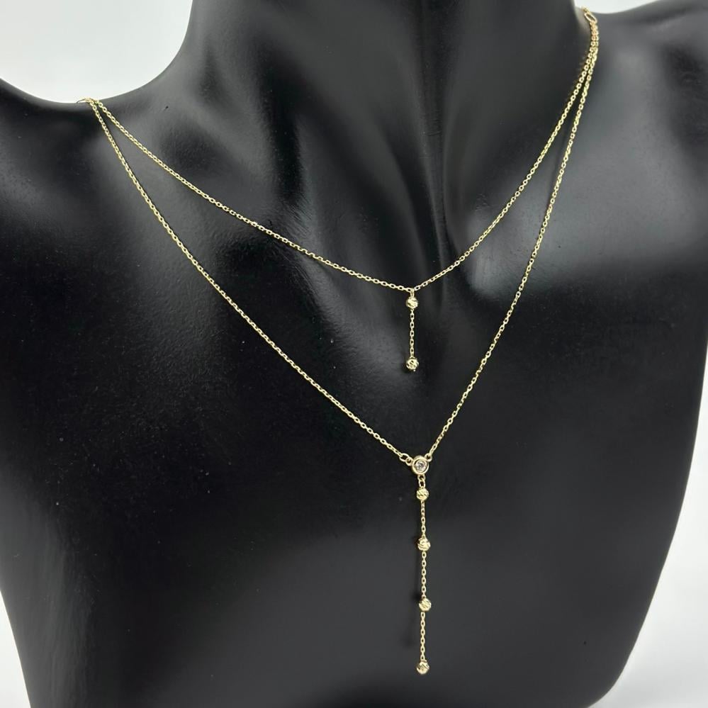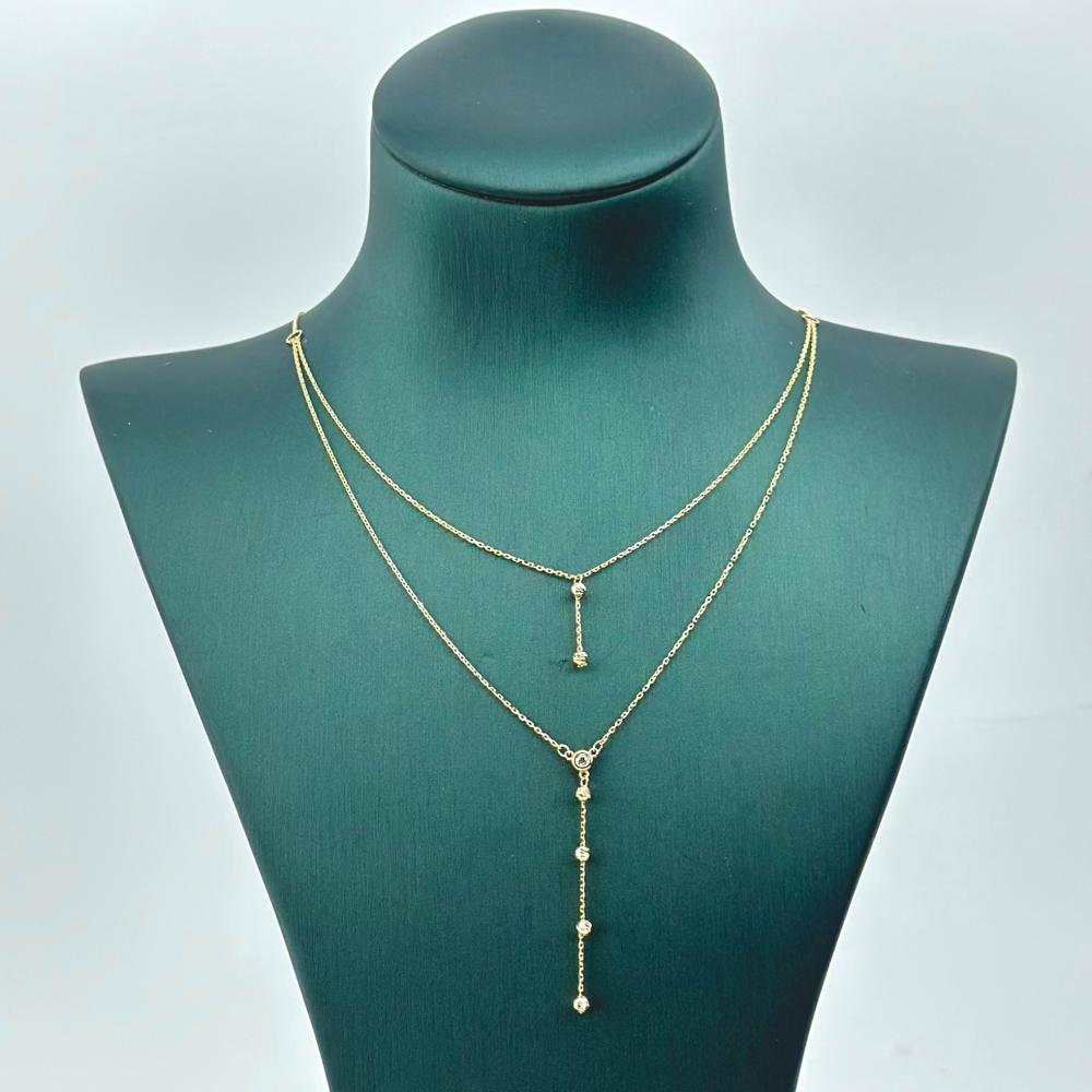 تألقي بعقد فاخر من الذهب عيار 18، مصمم بأناقة ليحمل كرات الليزر الذهبية متقنة الصنع, بدورين متناسقة هذا العقد المثالي يبرز جمالك في كل مناسبة، ويضفي لمسة من الرقي على إطلالتك.
