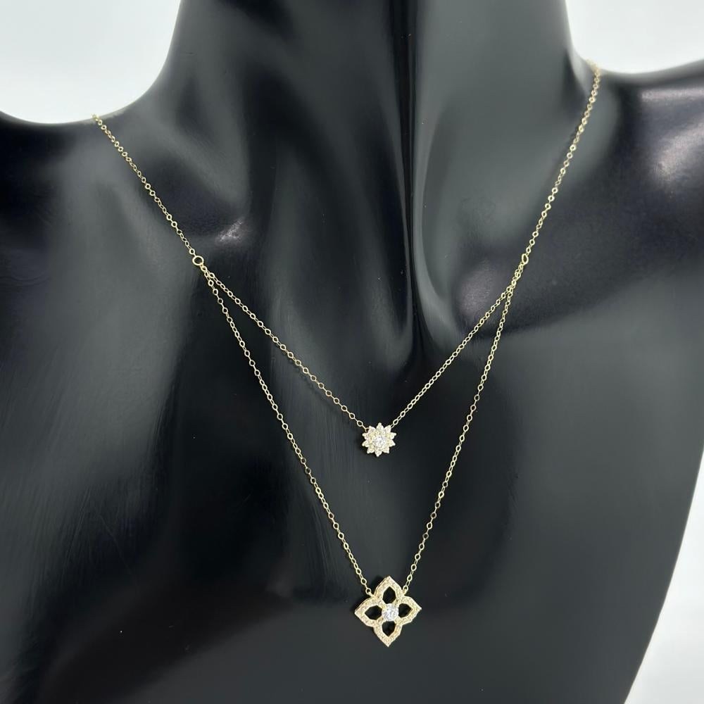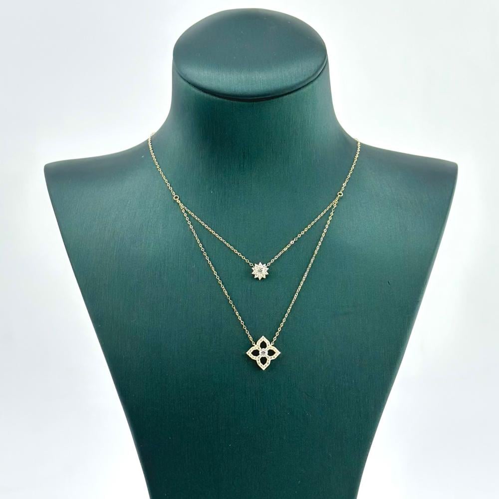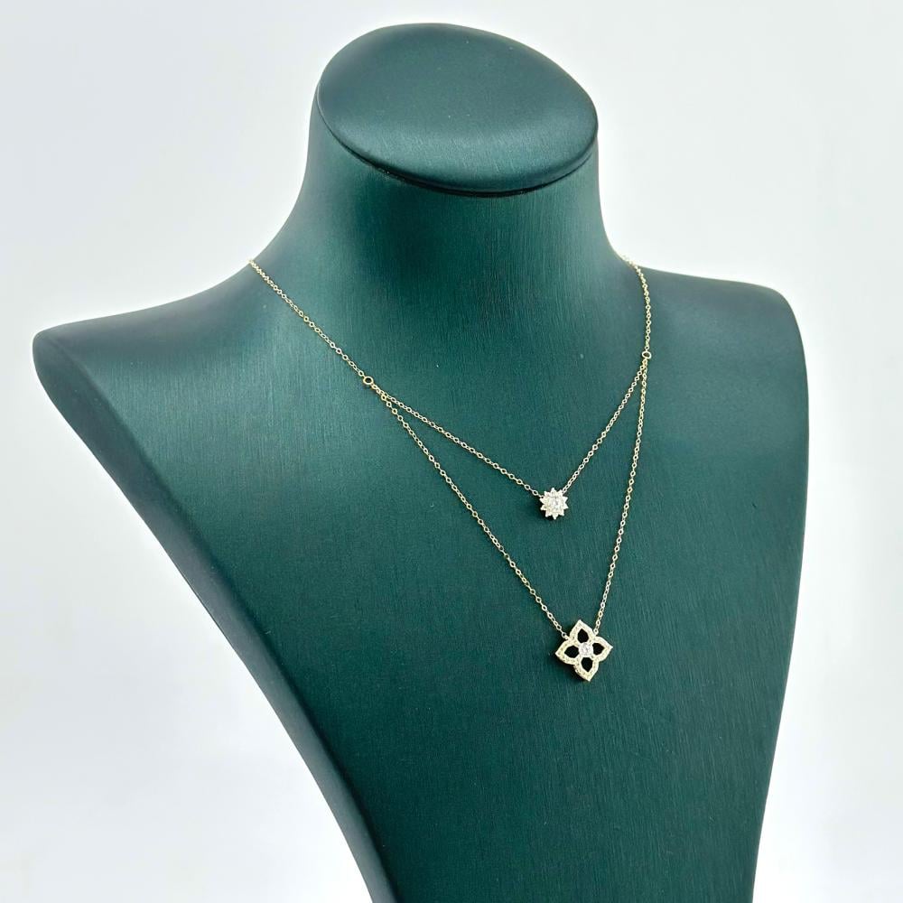 بقلادة ذهبية عيار 18، تتراقص حجارة الزركون كالنجوم في السماء. طابقين يحملان ذكريات لا تُنسى، تجسد روح الحب والوفاء. كل حجر زركون يروي قصة جديدة، مزيج من العشق والعمق، يجعل هذه القلادة أكثر من مجرد مجوهرات، بل رمزاً للارتباط الأبدي والعهد بالبقاء متحدين.