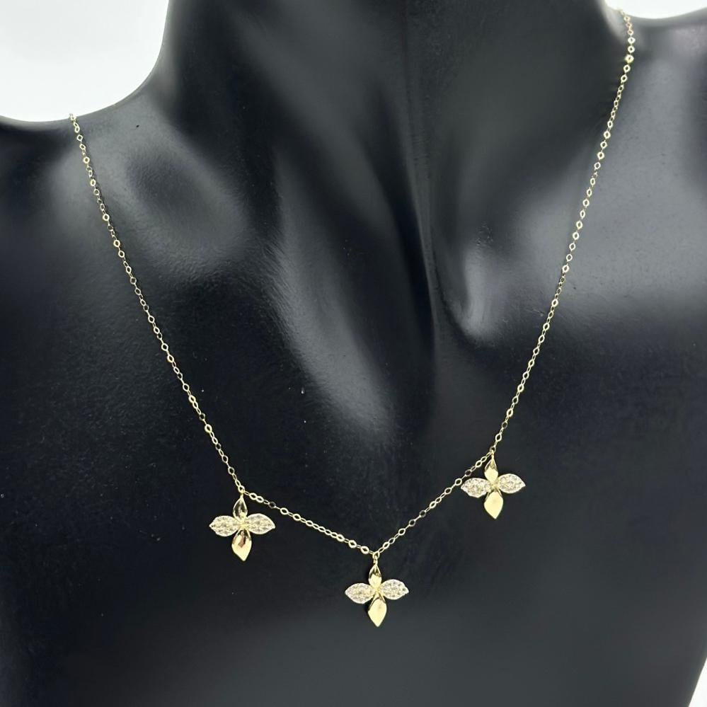 عقد ذهب ناعم عيار 18 وبوزن 1.3 جرام بتصميم ورود ثلاثية. خفيف وراقي، يناسبك إذا تحبين القطع الناعمة اللي تضيف لمسة أنوثة وجمال على طلتك.تفاصيل المنتج: