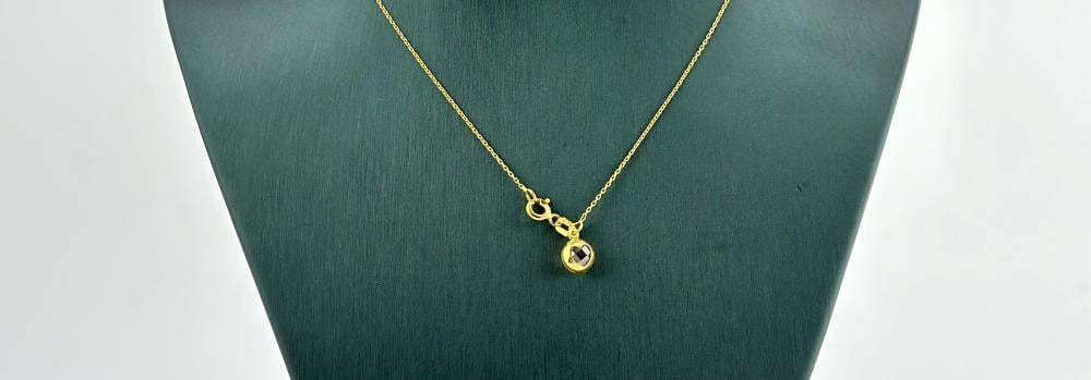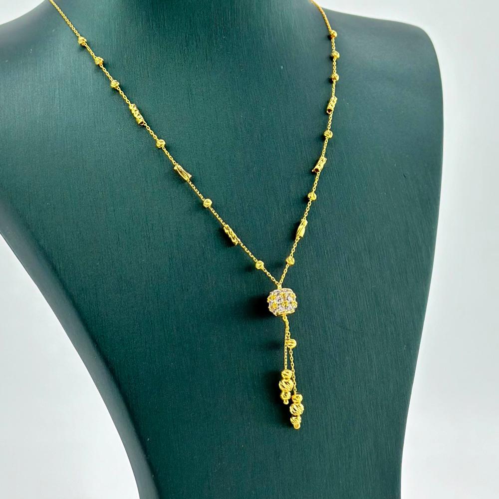 عقد من الذهب الأصفر عيار 21، يتوسطه كرة مرصعة بفصوص الزركون اللامعة، تعكس بريق الألماس في كل زاوية. مطعّم بكرات الليزر التي تضيف لمسة من التألق والحيوية، يجمع هذا العقد بين الفخامة والأناقة ليمنحك إطلالة ساحرة لا تُنسى.