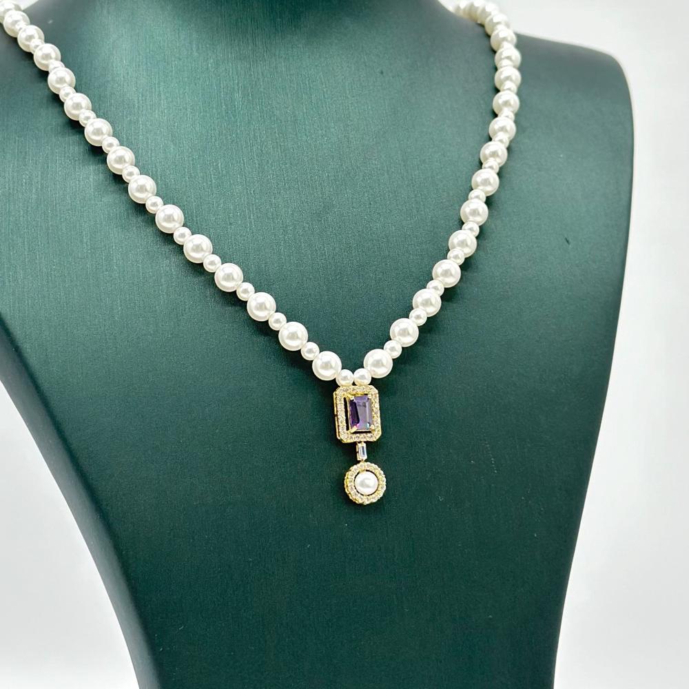 يتألق هذا العقد الفاخر بتناغم رائع بين لمعان اللؤلؤ ونقاء الذهب الأصفر عيار 18 قيراط. يتميز العقد بتصميم أنيق يجمع بين خيوط اللؤلؤ المتناسقة وحجر بنفسجي فاتن يضفي لمسة من الأناقة والرقي. تُكمل زخارف الزركون اللامعة جمال العقد وتضفي عليه المزيد من الفخامة.