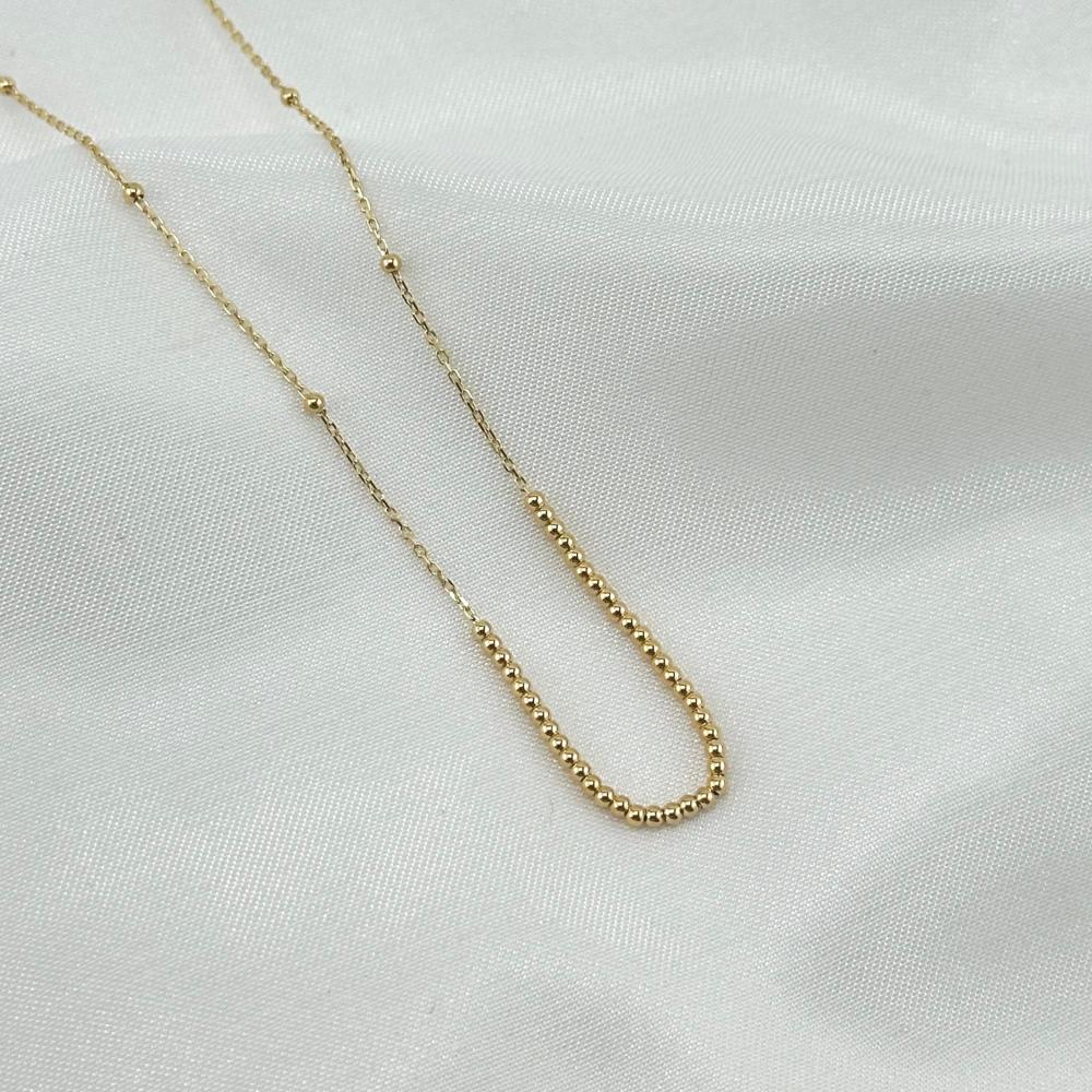 عقد وأسوارة من الذهب الأصفر عيار 18 بتصميم ناعم وبسيط، تحلّق حولك كرات الذهب الصغيرة كنجوم مضيئة تلامس بشرتك برفق. كل لمسة من هذا الطقم تروي حكاية من الأناقة الخالدة والبساطة الجذابة، ليضفي على إطلالتك سحراً لا يُقاوم، كهمسة رقيقة من الفخامة.✨